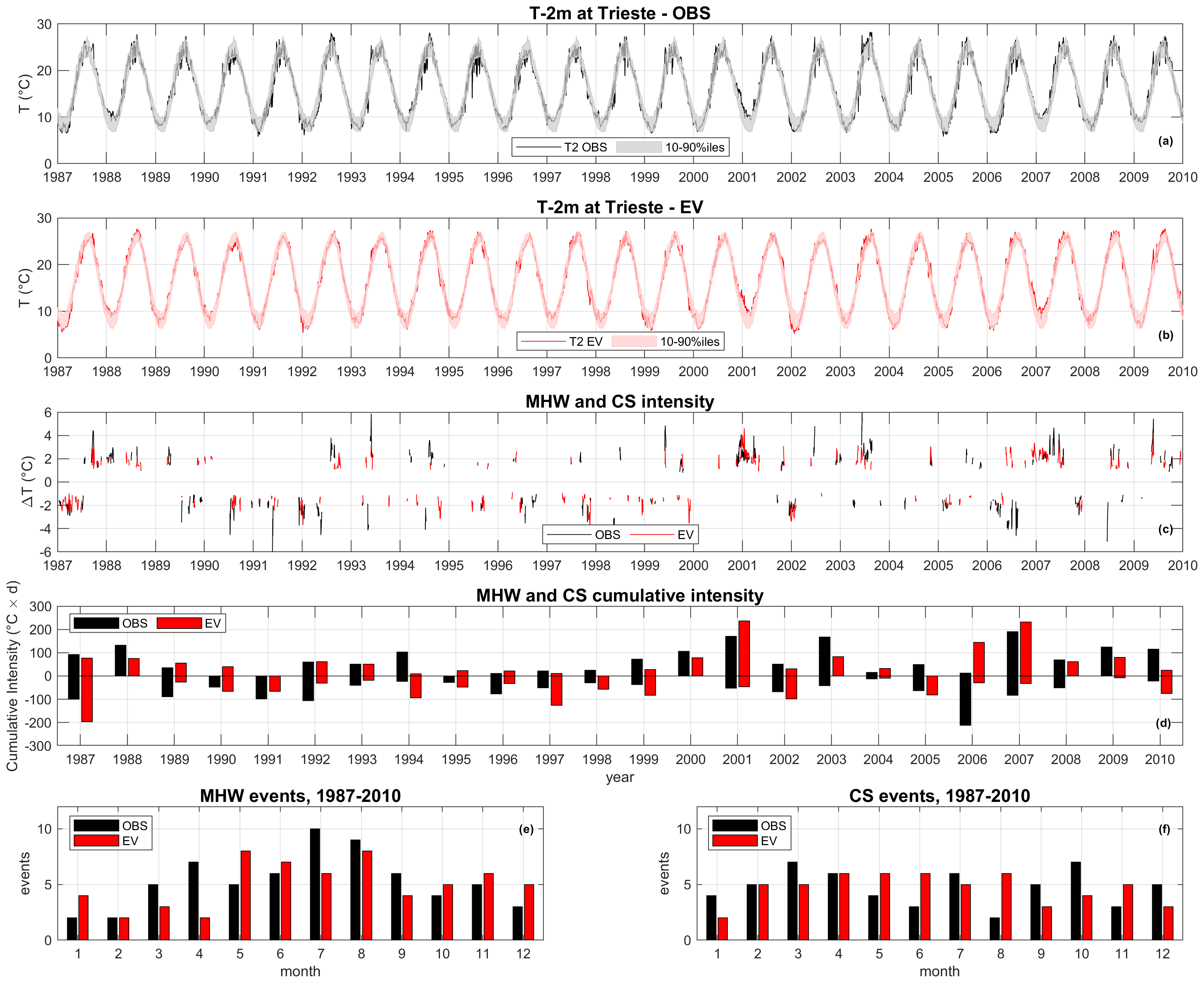 Figure 13Comparison of modelled (EV) and observed thermal extreme events at Trieste station. Panels (a)–(b) represent respectively the observed and modelled time series alongside the identification of the 10th and 90th daily percentiles for the period (here computed as a moving average within a 15 d sliding window). Panel (c) highlights the events found in either series and their intensity. Panel (d) compares the yearly cumulative intensity of the extreme events. Panels (e)–(f) compare for each month the observed and modelled number of MHWs and CSs respectively).