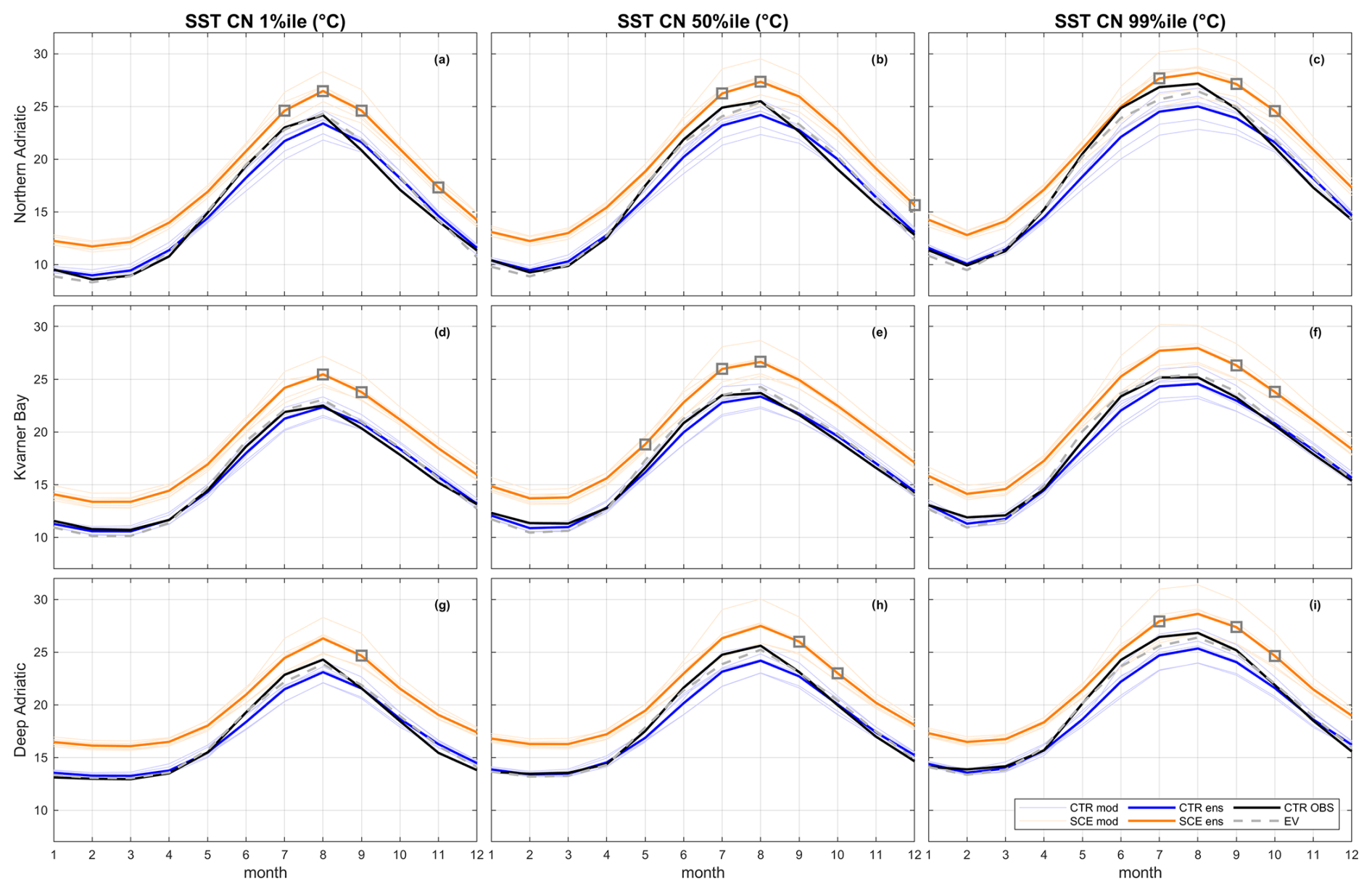 If the focus on the EV run allows the investigation of the model skills in the presence of the best available if not actually “perfect” information, the analysis of the climate ensemble in the recent past provides, besides of course a terms of reference for comparison against the future figures, a further element to complement the evaluation by verifying to what extent the observed climate statistics in the recent past are well reproduced also in a GCM-driven condition. In this direction, and again with reference to the three subdomains considered in Fig. 12, the climate normals of the monthly values of 1st, 50th, and 99th percentiles of SST in different datasets are shown in Fig. 14 including also statistics from observed data and the EV run. As a recurring pattern, the climate ensemble statistics appear to satisfactorily match the observations in the winter months while underestimating and overestimating respectively summer and autumn values, most likely as a result of the description of the fluxes of heat along the upper layers of the water column associated with the excess mixing described in Sect. 3.1. This behaviour is more evident in the Northern Adriatic, where the maximum mismatch reaches 2.7 °C for the 99th percentile in June. The ensemble spread is generally narrow (around 1 °C) from October to April both in CTR and SCE conditions and significantly larger (> 4 °C) in summer, particularly in the SCE datasets, in some cases obscuring the statistical significance of the future change signal. An examination of uncertainty partitioning through the different modelling chain steps lies beyond the scope of the present study. However, speculations can be made about the well-known large uncertainty characterising GCMs in reproducing crucial mid-latitude summer season dynamics like blocking atmospheric patterns (Davini and D’Andrea, 2020) and their response to a warmer climate (Woollings, 2010; Woollings et al., 2018). Nevertheless, another source of ensemble variability could be given by the non-linear ingestion of the GCM large-scale signal into the local-scale forcing in the nested simulations (SMHI-RCA4 and ROMS) given the non-linear ingestion of the GCM large-scale signal.
