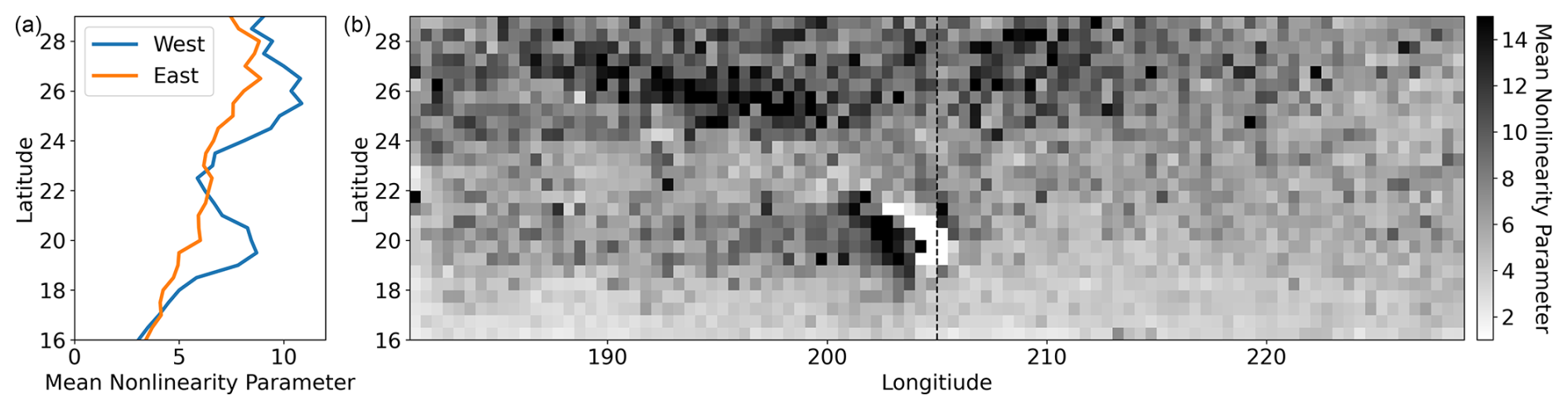 The “Hawaiian lee eddies” are large, long-lived features that consistently form in the lee of the Hawaiian Islands (Fig. 5a). Anticyclones are generated by the shear instability between the eastward-flowing Hawaiian Lee Countercurrent and the westward-flowing North Equatorial Current (Calil et al., 2008; Yoshida et al., 2010; Liu et al., 2012). Lee cyclones are produced from wind stress curl anomalies due to trade wind blocking by the islands (Lumpkin, 1998; Dickey et al., 2008; Yoshida et al., 2010). The Hawaiian Lee Countercurrent to the south and the westward-flowing Hawaiian Lee Current to the north sustain the cyclonic vorticity, evident from bands in the sign of polarity probability to the west of the islands (Fig. 4a).