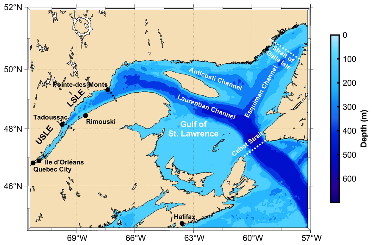 Figure 1Map and bathymetry of the Gulf and St. Lawrence Estuary. Each of the three main deep channels is labeled along with the two straits that connect with the western North Atlantic. Key landmarks are identified as well as the boundaries between the Upper St. Lawrence Estuary (USLE), Lower St. Lawrence Estuary (LSLE), and Gulf of St. Lawrence (GSL).