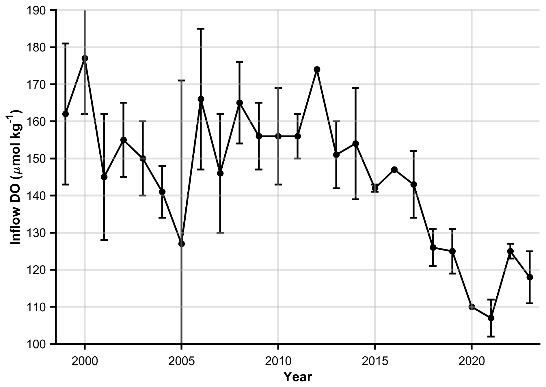 Figure 2Time series of dissolved oxygen (DO) concentrations (µmol kg−1) in the deep-layer inflow through the Cabot Strait, defined between the 27.15–27.3 kg m−3 isopycnal surfaces. Values from 1999–2020 were provided by Mathilde Jutras (personal communication, 2024). Estimates from 2021 onward were derived from the intercept of the along-channel DO gradient.