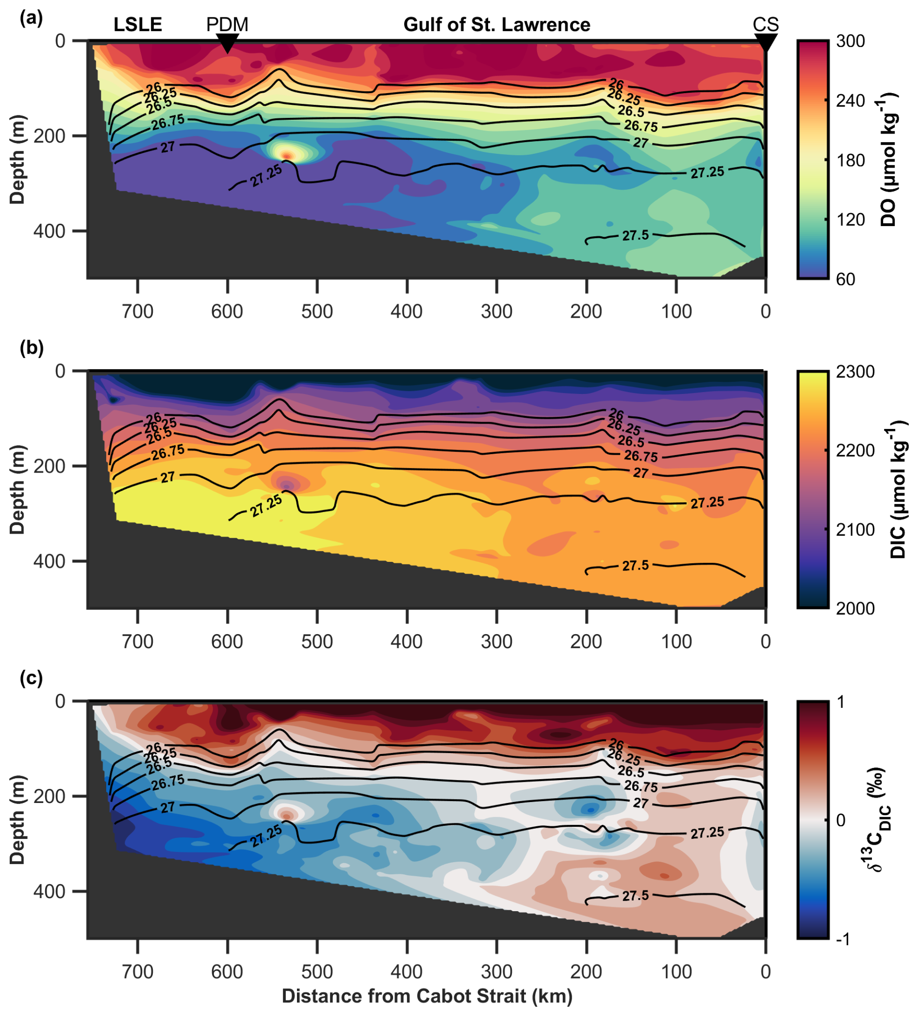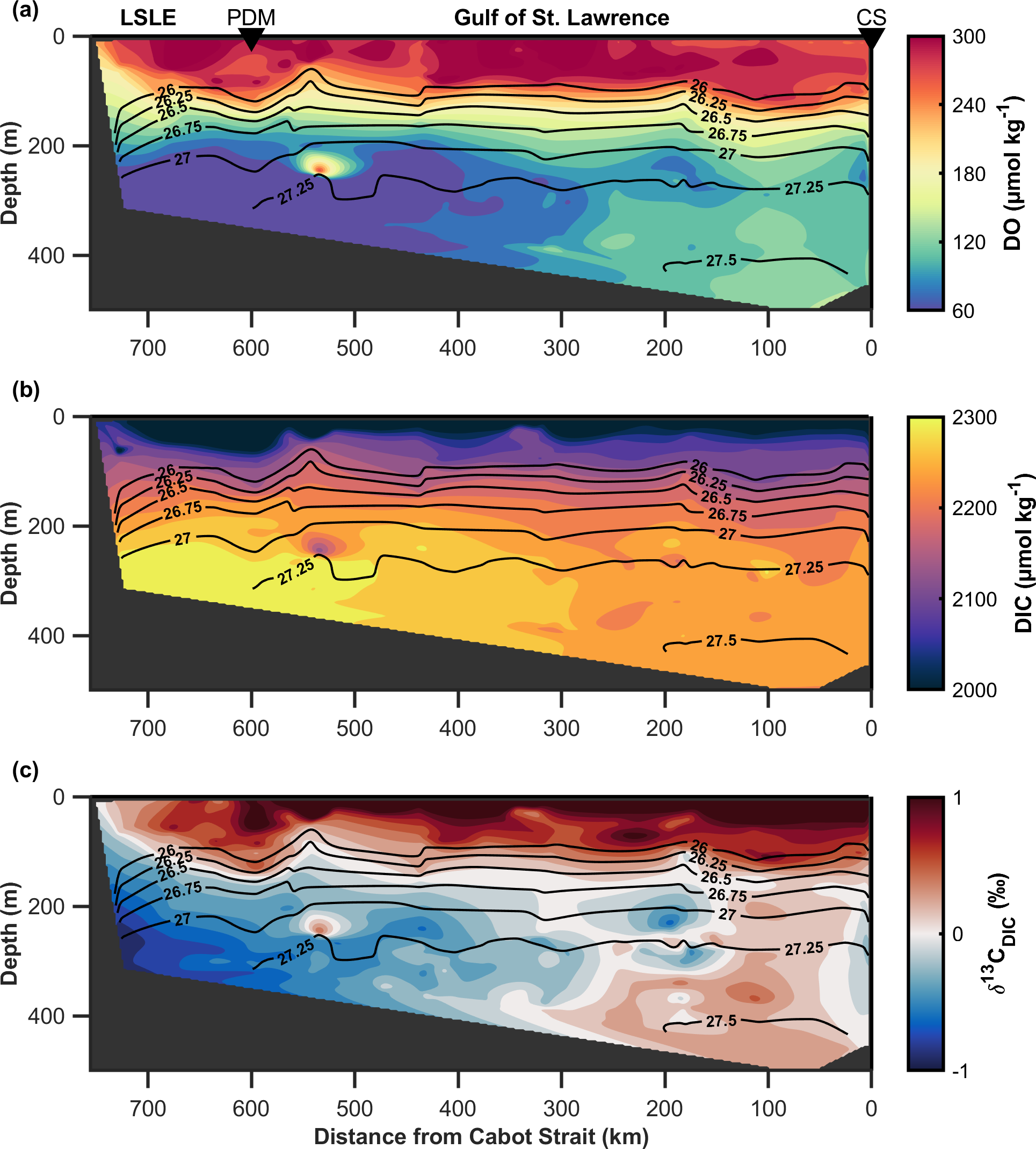 Figure 3Along-channel sections of (a) dissolved oxygen (DO) and (b) dissolved inorganic carbon (DIC) concentrations, (c) δ13CDIC in the Laurentian Channel (LC). The data were collected over the course of four cruises during the 2021–2023 TReX project. Discrete data from each individual survey were interpolated onto a grid using a natural neighbor interpretation for DO, DIC, and δ13CDIC and linear interpolation for isopycnals. The x-axis shows the distance (in km) from the Cabot Strait (CS), the entry point for the deep-layer inflow into the Gulf of St. Lawrence. Key locations are marked above sub-plot A with black triangles: Cabot Strait (CS), Pointe-des-Monts (PDM), that define the transition between the Gulf of St. Lawrence (GSL) and the Lower St. Lawrence Estuary (LSLE) (Fig. 1). Contoured black lines denote the mean isopycnal distribution, with key density surfaces labeled.