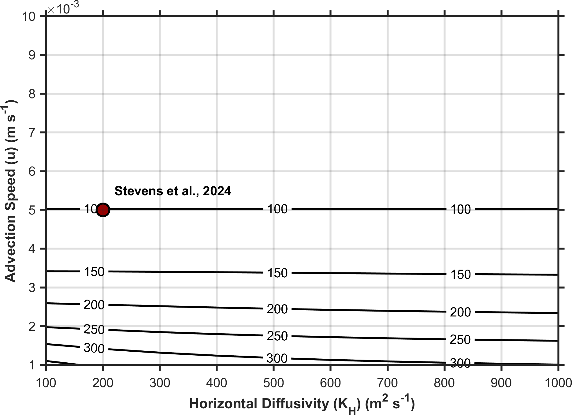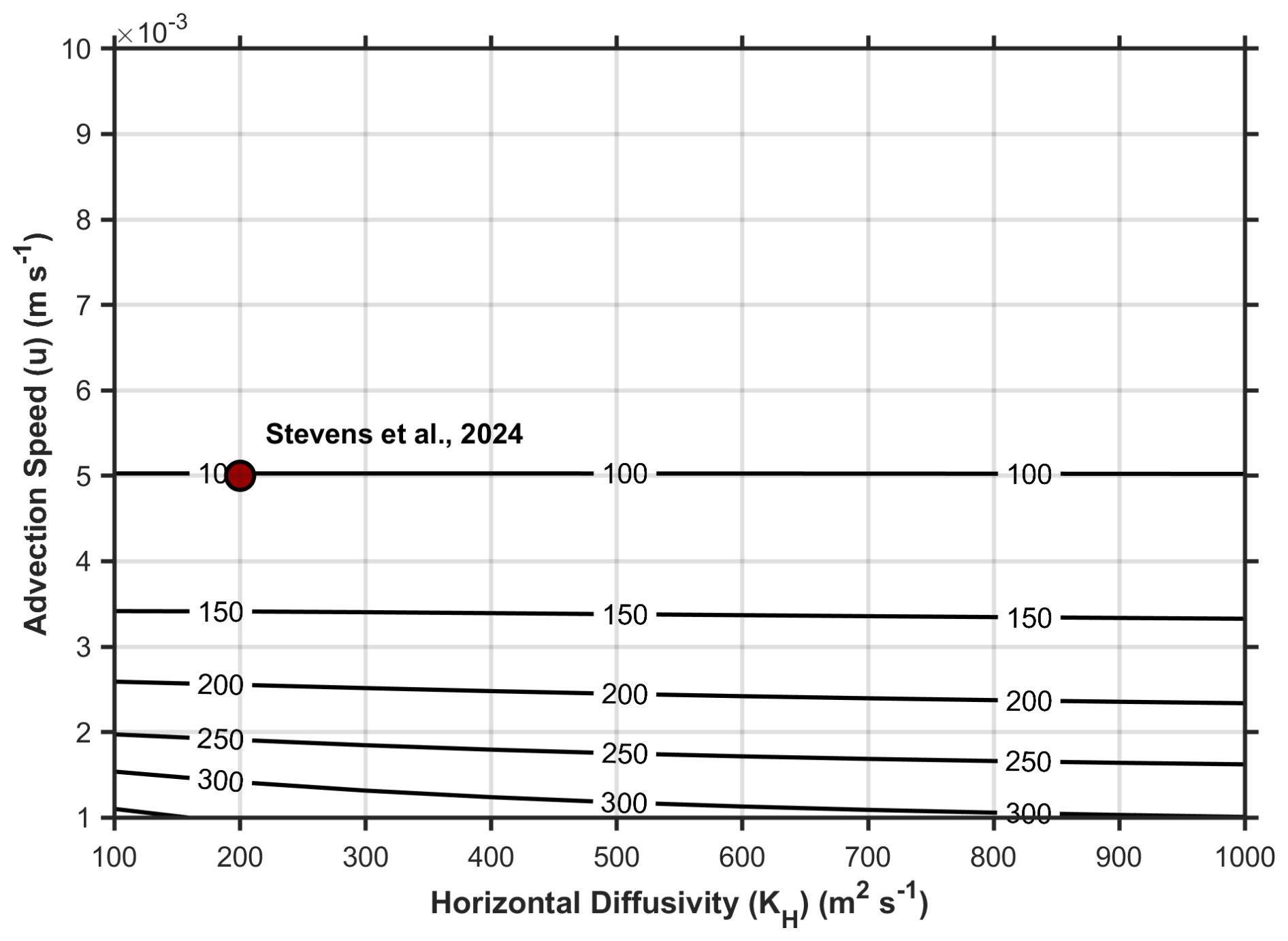Recent tracer observations reveal that the local timescale for average horizontal transport within the deep layer of the LC is far less than that of vertical mixing (Stevens et al., 2024). The timescale for vertical eddy diffusion can be estimated from dimensional analysis (Bourgault et al., 2012) as follows: