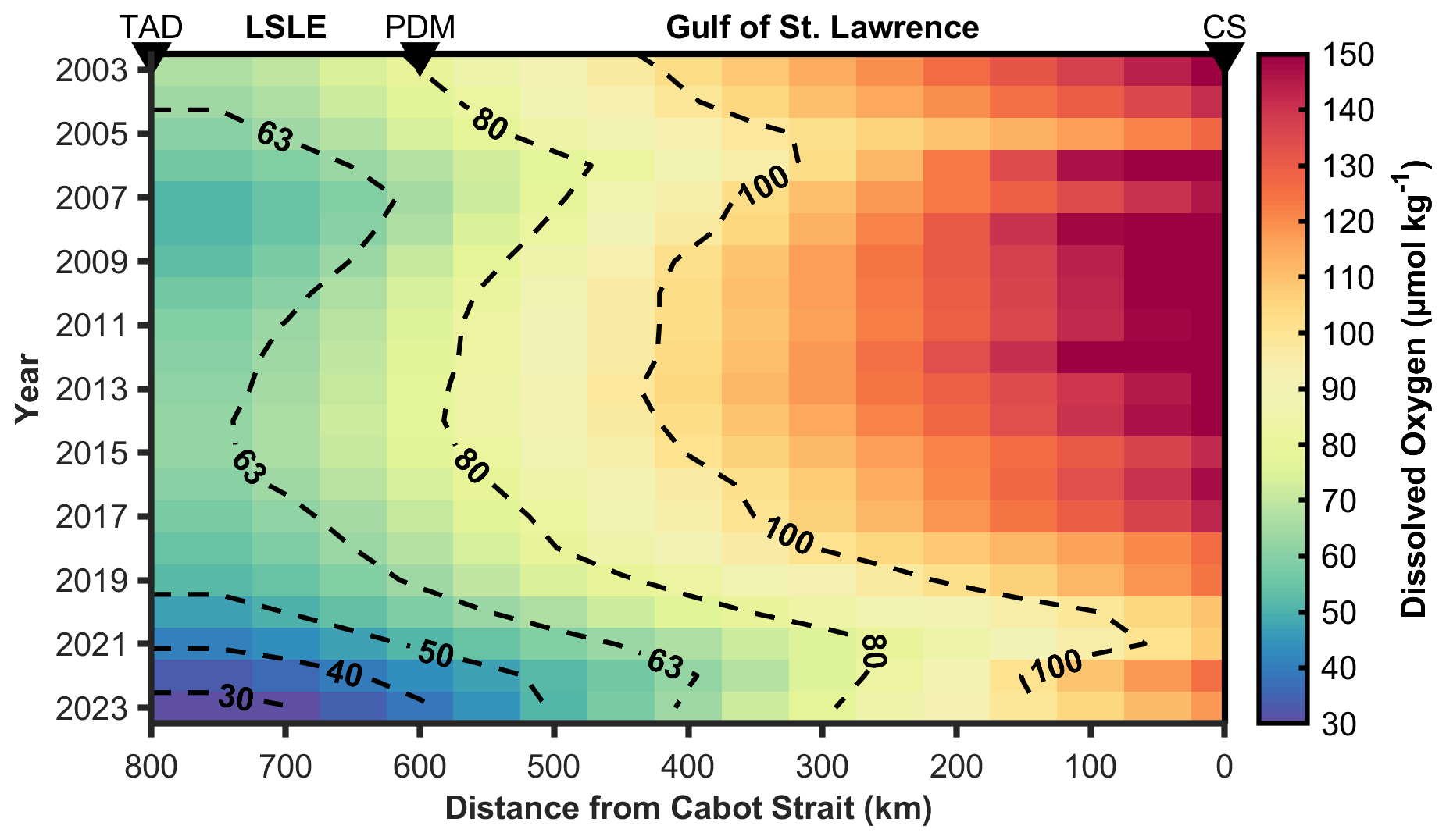 Figure 5Modeled deep-layer dissolved oxygen (DO) concentrations along the Laurentian Channel from 2003 to 2023 between the 27.15–27.30 kg m−3 density layers. The x-axis shows the along-channel distance (in km) from the Cabot Strait (CS), the entry point of the deep-layer inflow to the Gulf of St. Lawrence from the western North Atlantic. Important landmarks along the transect are marked with black triangles: Cabot Strait (CS), Pointe-des-Monts (PDM), indicating the transition between the Gulf of St. Lawrence (GSL) and the Lower St. Lawrence Estuary (LSLE), and Tadoussac (TAD), the head of the LC and LSLE. Dashed black contours highlight specific oxygen levels (µmol kg−1) to aid identify spatial and temporal trends.