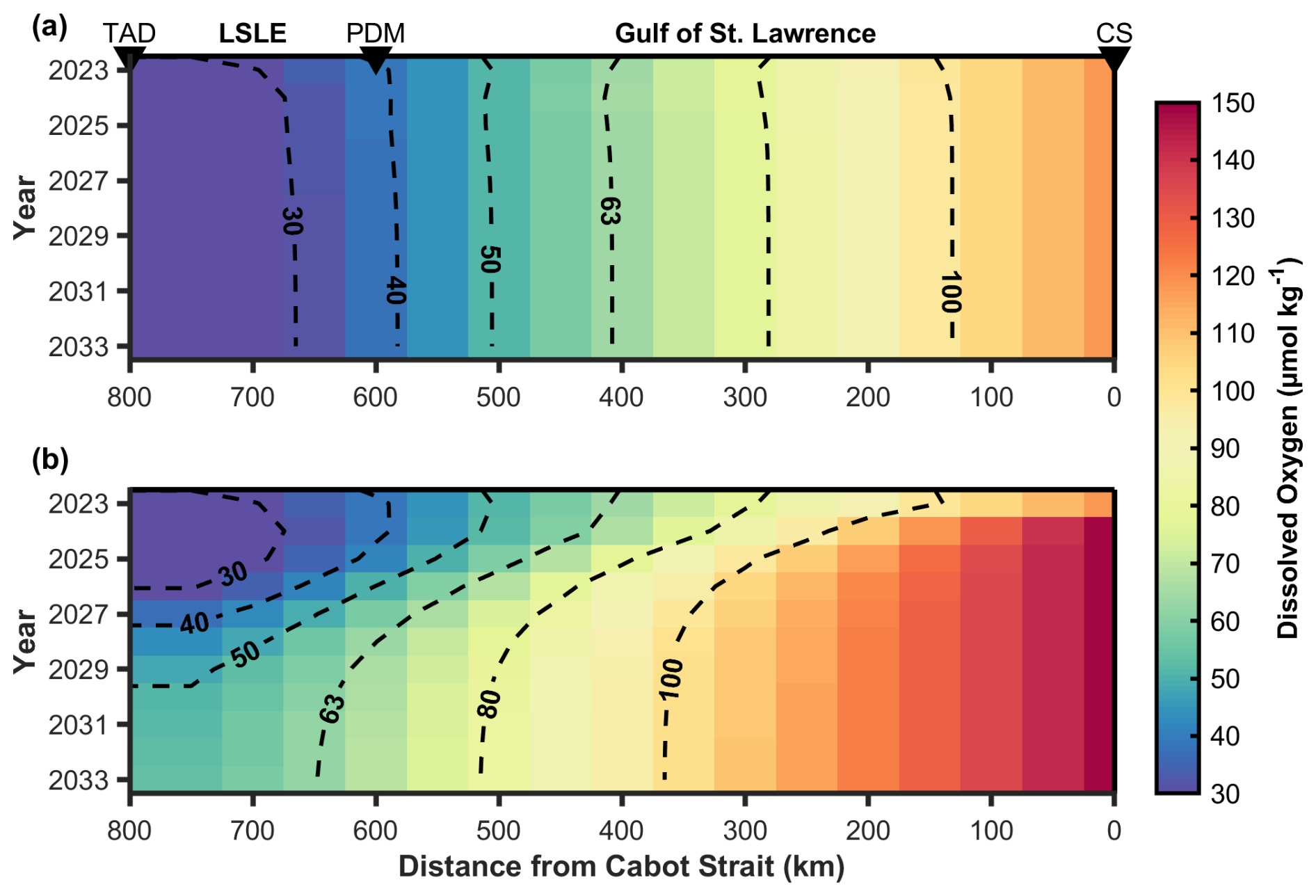 In scenario (b), the hypoxic front progressively migrates westward toward the head of the LC within the first 5 years. By year 10 (2033), when the system has reached a new steady state, the hypoxic zone would have migrated approximately 250 km from its 2023 condition (near Anticosti Island), retreating into the LSLE near Pointe-des-Monts. These conditions are similar to those observed within the deep layer at the turn of the millennium (see Fig. 2 in Jutras et al., 2023b).