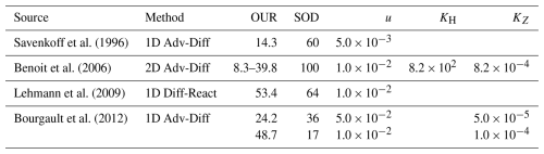 Previous estimates of along-channel advection velocities (u) range from to m s−1 (Bugden, 1991; Gilbert, 2004; Rousseau et al., 2025) with horizontal eddy diffusivities (KH) ranging from 2.8 × 102 to 8.2 × 102 m2 s−1 (Bugden, 1991; Savenkoff et al., 2001; see Table 1). Perhaps the most consequential, dissonant parameter in previous modeling efforts is the vertical eddy diffusivity (KZ), with published estimates ranging over several orders of magnitude, from 1.0 × 10−5 to 2.2 × 10−3 m2 s−1 (Benoit et al., 2006; Bugden, 1991; Mertz and Gratton, 1995). Likewise, the oxygen utilization rate (OUR) within the inflowing deep layer has been estimated by a variety of quantitative methods and models (Benoit et al., 2006; Bourgault et al., 2012; Jutras et al., 2020; Lehmann et al., 2009; Savenkoff et al., 1996) with only one attempt (Savenkoff et al., 1996) to include an estimate of the accompanying DIC accumulation rate. Previous OUR estimates (converted to µmol kg−1 yr−1) are summarized in Table 1 and a detailed summary of these studies can be found in the Supplement (Sect. S1).
