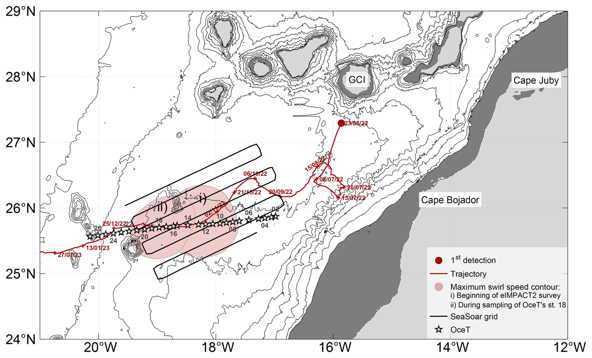 An interdisciplinary oceanographic survey was conducted aboard the R/V Sarmiento de Gamboa from 9 November to 4 December 2022, as part of the Biogeochemical Impact of Mesoscale and Sub-mesoscale Processes Along the Life History of Cyclonic and Anticyclonic Eddies (eIMPACT) project. This survey, called the eIMPACT2 survey, targeted a mature AE which originated southwest of Gran Canaria island (GCI). The eddy has been named Bentayga, inspired by the Saharan-Berber heritage of the Canarian aborigines, reflecting its connection to Saharan upwelling waters off the northwestern African coast. At the time of the survey, it was approximately 4.5 months old and had traveled 560 km from its formation site (Fig. 1).