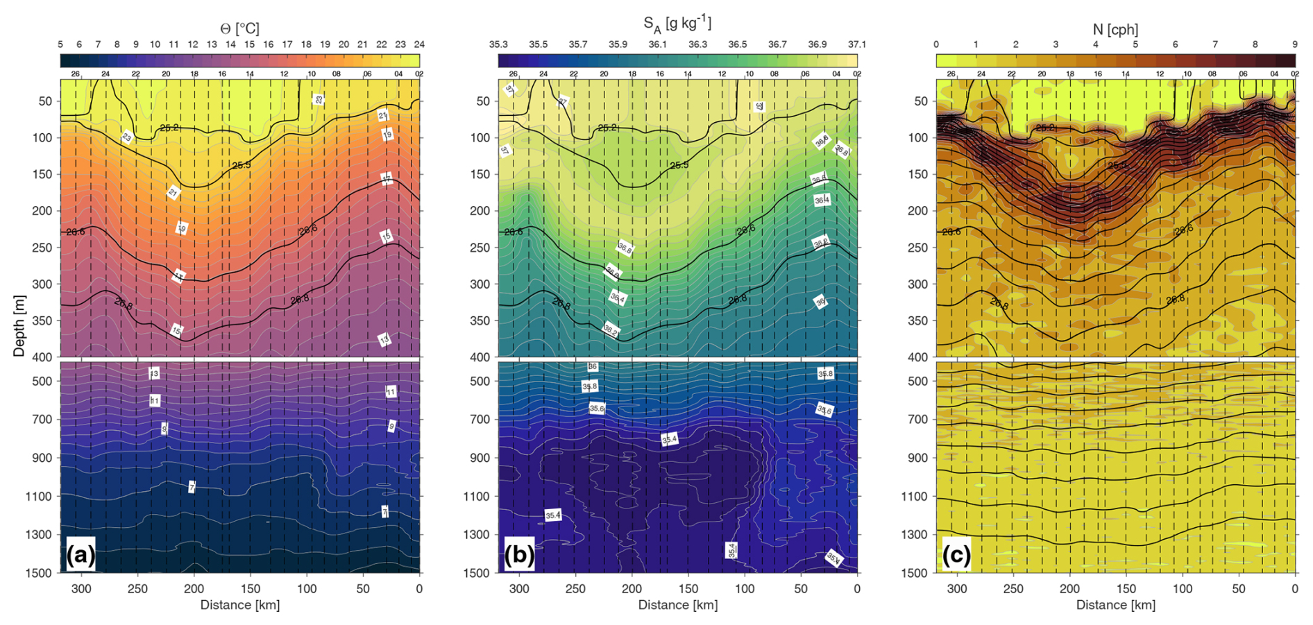 Figure 5Vertical sections along the OceT of (a) conservative temperature (Θ), (b) absolute salinity (SA), and (c) Brunt–Väisälä frequency (N). In panels (a) and (b), thick black contours correspond to σθ levels of 25.2, 25.5, 26.6, and 26.8 kg m−3. In panel (c), black contours represent isopycnals (σθ) ranging from 25.2 to 27.7 kg m−3, with a contour interval of 0.1 kg m−3. Vertical dashed lines indicate the positions of oceanographic stations as shown in Fig. 4a. Consistent with Fig. 4, different vertical scales were applied for the 0–400 m and 400–1500 m depth ranges.