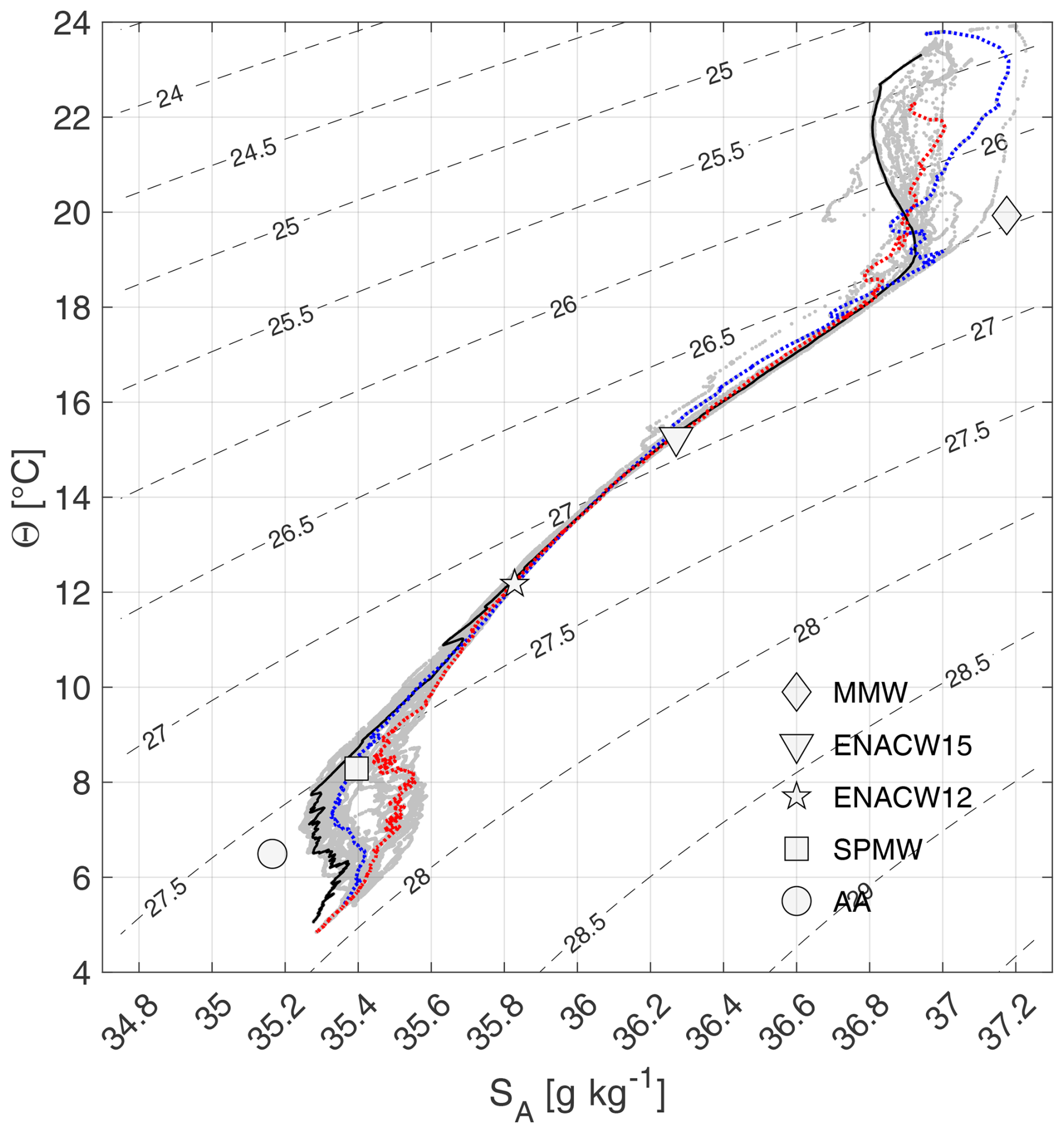 Figure 6Conservative temperature (Θ) versus absolute salinity (SA) distribution along the OceT transect, presented as a Θ−SA diagram. Gray dots represent data from all oceanographic stations. The thermohaline structure at the eddy center (station 18) is highlighted with a thick black continuous line. Thermohaline properties from regions outside eddy's influence, westward (station 26) and eastward (station 04), are depicted with thick blue and red dashed lines, respectively. Symbols mark typical source water masses for the area (Alvarez et al., 2005), including Madeira Mode Water (MMW), Eastern North Atlantic Central Water (ENACW15 and ENACW12, at 15 and 12 °C, respectively), Subpolar Mode Water (SPMW), and diluted Antarctic Intermediate Water (AA). Thin black dashed lines denote σθ levels from 24 to 29 kg m−3 at intervals of 0.5 kg m−3.