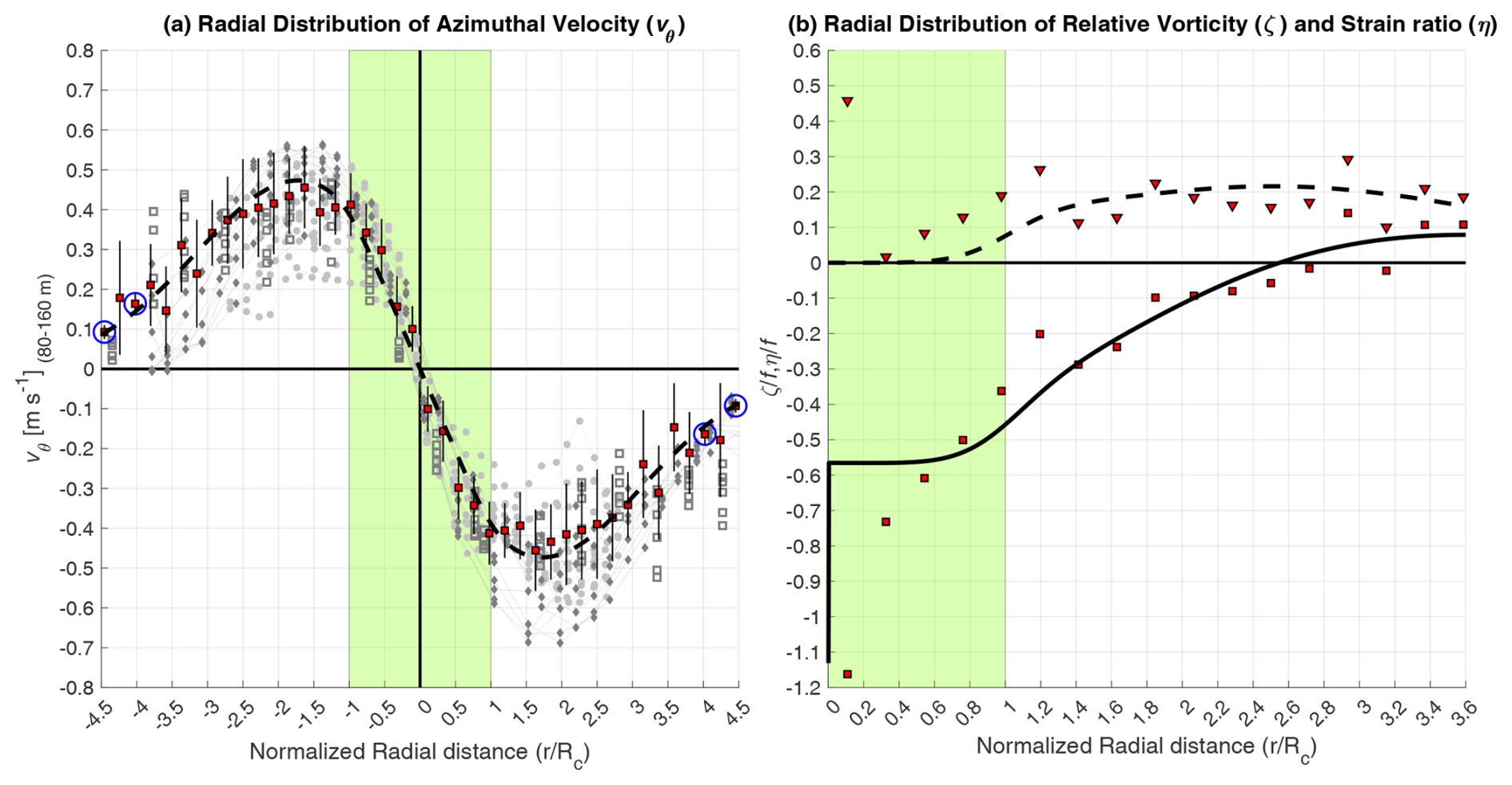 Water parcels that follow curved trajectories within an AE require a net centripetal acceleration to maintain their motion in equilibrium. In these conditions, the appropriate momentum balance is the cyclogeostrophic one, which includes this centripetal acceleration explicitly (Flierl, 1979; Kunze, 1986; Olson, 1980; Shakespeare, 2016). Assuming steady, inviscid, and axisymmetric flow, the radial component of the horizontal momentum equation becomes
