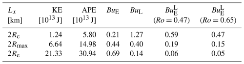 The total available potential energy (APE) and kinetic energy (KE) within the eddy were estimated using volume integrals based on the approach of Schultz Tokos and Rossby (1991), applied to the hydrographic and current records collected along the OceT transect. For both integral calculations, the eddy's volume was assumed to be cylindrical and treated as an isolated structure within an infinitely wide ocean basin (Hebert, 1988), where unperturbed hydrographic fields explicitly define the reference ocean state. The estimation of these reference fields is described further in Sect. 3.2. The integrals were performed over the water column, from the surface (z=0) to the trapping depth (z=H) (e.g., Dilmahamod et al., 2018; Morris et al., 2019), and radially, from its center (r=0) to its core radius (; see Sects. 3.2 and 3.5). The total APE was calculated as follows: