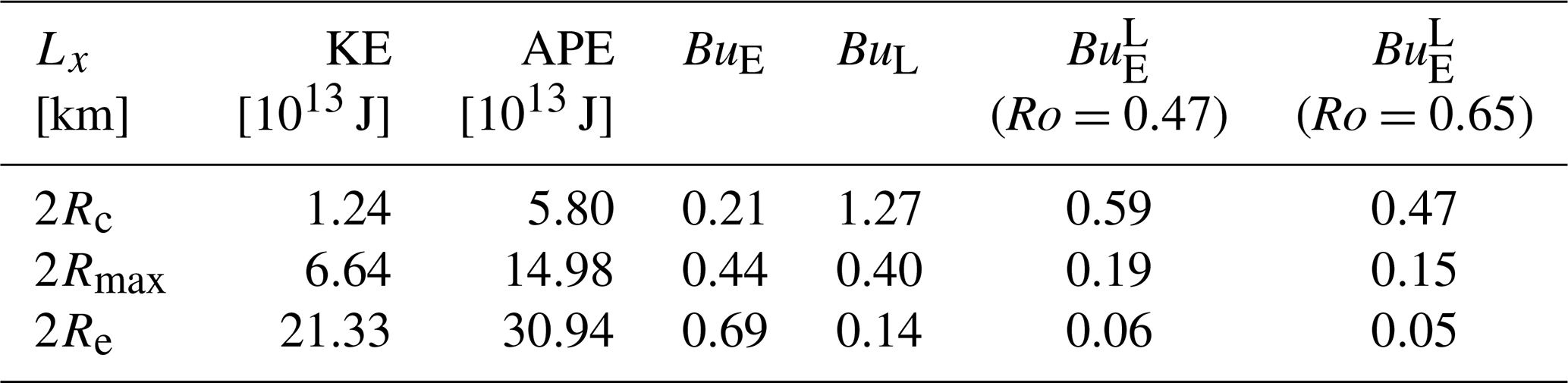 where ρr is the density of the reference state, Nr(r,z) is the Brunt–Väisälä frequency of the reference state, δ(z,r) represents the vertical departures of the isopycnal surfaces from the reference state, and 2πrdr is the infinitesimal area element. The total KE within the eddy was calculated as