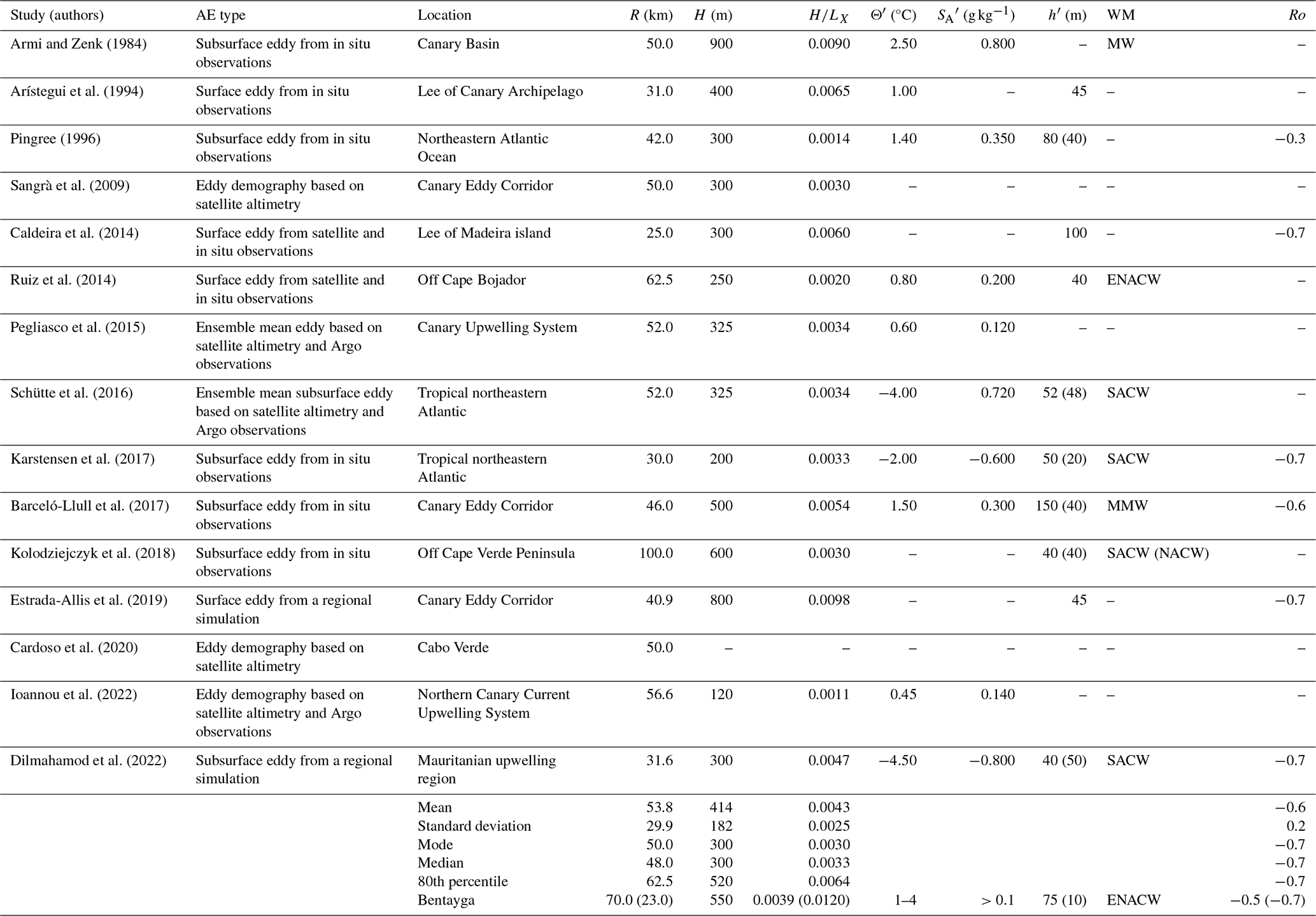 The CEC extends from 22 to 29° N and is predominantly populated by long-lived anticyclonic eddies (AEs) generated south of Tenerife and Gran Canaria islands (Sangrà et al., 2005, 2007, 2009). The dominance of these AEs has been extensively documented through a combination of in situ and satellite observations (Pingree, 1996; Pingree and Garcia-Soto, 2004; Sangrà et al., 2009), as well as various eddy detection and tracking methods (Chaigneau et al., 2009; Sangrà et al., 2009; Mason et al., 2014). Notably, Pegliasco et al. (2015) reported that 40 % of the long-lived AEs within the CEC exhibit subsurface intensification, with warm and salty anomalies extending to depths of up to 800 m.