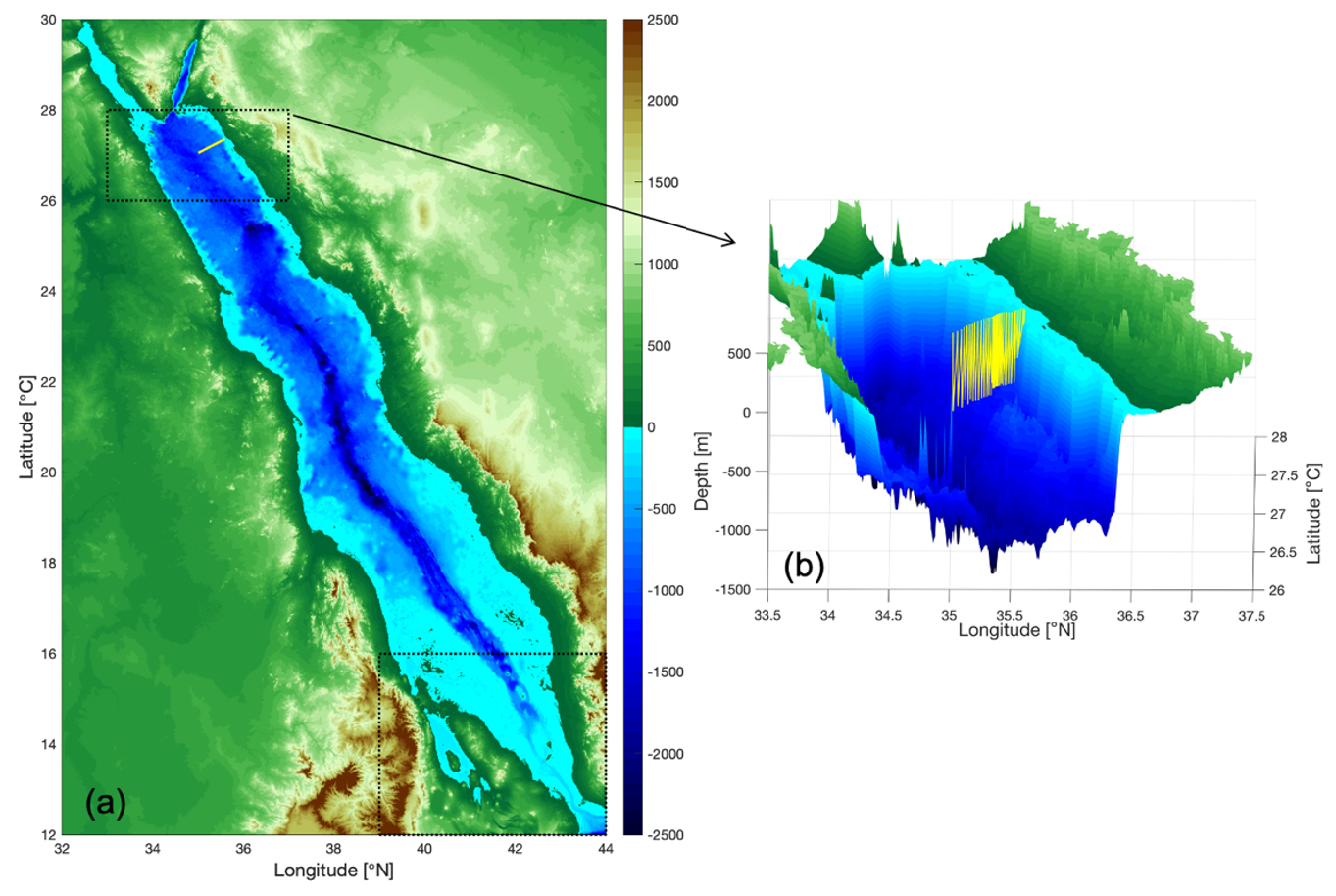Figure 1(a) Topographic map of the RS. The two black dashed boxes in the northern and southern RS show the study area in the north and the region in the south where exchange with the Gulf of Aden occurs. The yellow line inside the northern box indicates the glider line location, and (b) the yellow sawtooth line represents the undulating trajectory of the glider superimposed on the bathymetry, which has been reproduced from the GEBCO_2021 Grid, GEBCO Compilation Group (2021; https://doi.org/10.5285/c6612cbe-50b3-0cff-e053-6c86abc09f8f).