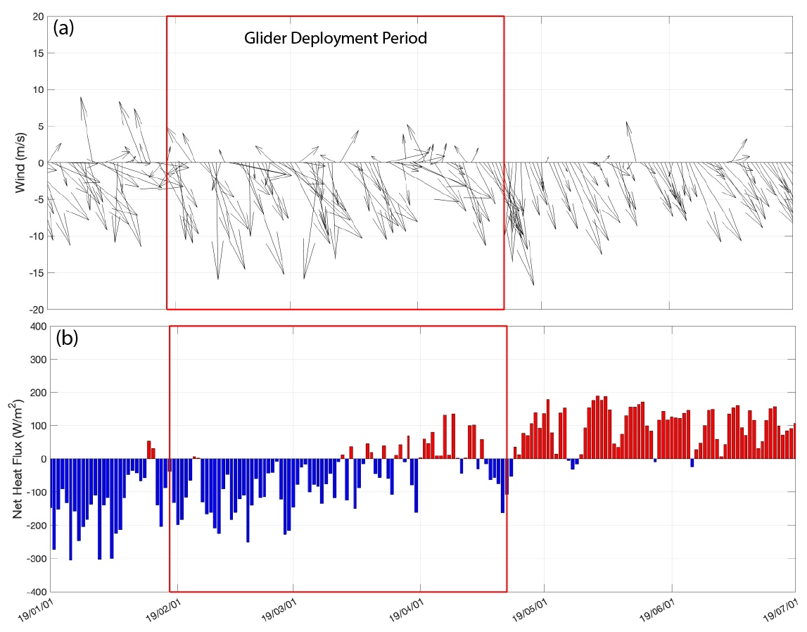 We examined the relationship between the first mode of the EOF and atmospheric forcing using a time-lagged correlation. No clear correlation was discernible from this analysis (not shown). However, in comparison with the previously published observations from 2016 (Asfahani et al., 2020), the period of negative average heat flux lasted longer into the spring. Thus, there is an overall difference in the duration of the negative heat flux between the 2016 observations and the observations in 2019.