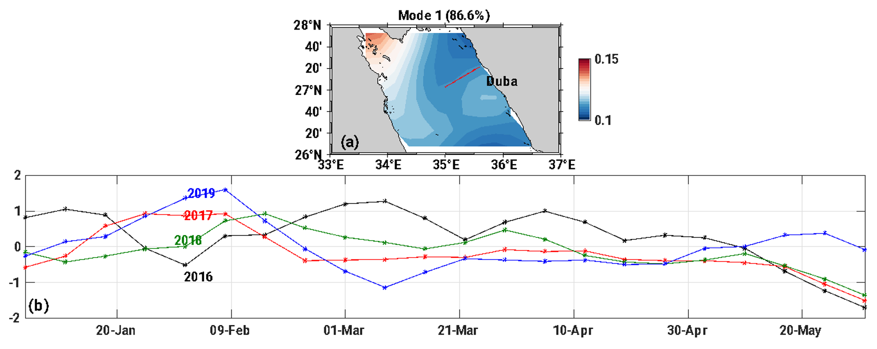 To evaluate the similarities to and differences from previous years, an EOF analysis was performed of the SLA data between 26 and 28° N over a period of 4 years that was considered efficient (from 2016 to 2019; Fig. 9). The first mode of the EOF describes 86.6 % of the SLA variation (Fig. 9a). In the years 2016–2018, the EOF of the SLA showed a relatively positive or neutral pattern during the winter–spring transition period, which continued until May, when the EOFs typically decreased (Fig. 9b). This late spring decrease generally coincides with the transition from a net negative air–sea heat flux to a net positive flux (see Fig. 2b). For 2019, the first mode of the EOF showed a distinct increase in late January through mid-February and then became negative through mid-March, in contrast to the pattern in previous years. This negative phase is consistent with the period when the circulation was anticyclonic (Fig. 9b). The flow of warmer, fresher water from the south was apparently blocked during this period, and the temperature became relatively homogeneous in the NRS, as was previously observed in the CRS (Zarokanellos et al., 2017). Recently, a study by Mohamed and Skliris (2025) showed that the annual climatology of the sea level is generally higher on the eastern boundary of the RS compared with the western boundary, where many areas with isolated patches of higher or lower values of the SLA indicate mesoscale activity. The maximum values correspond to regions where AEs are present. In our study, the negative phase of the EOF analysis (Fig. 9b) aligns with the presence of AE in the NRS.