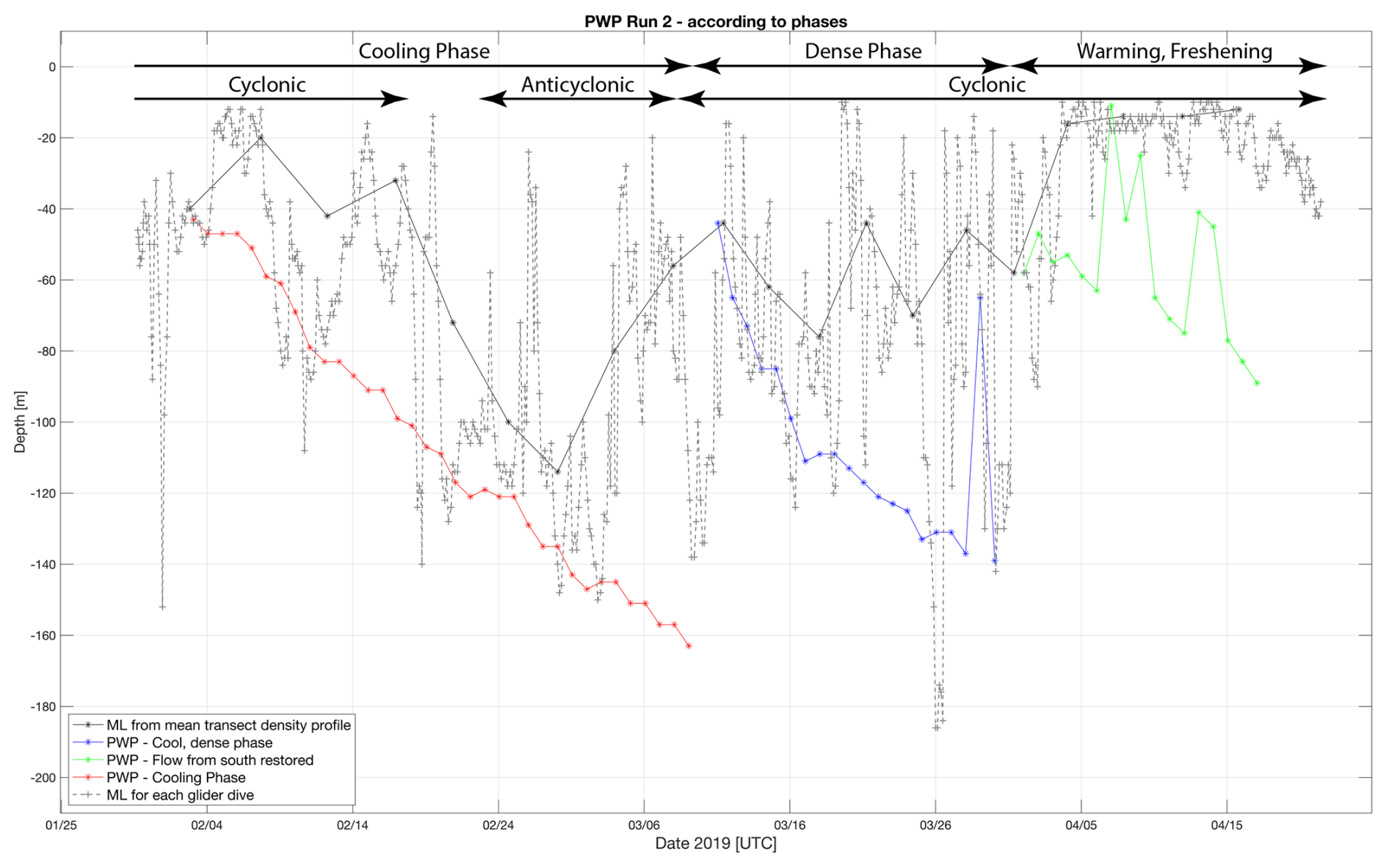 Figure 10 shows the evolution of the MLD in the upper 200 m based on the PWP simulation. Three separate PWP simulations were performed, initiating each simulation at the onset of one of the three phases determined from the in situ observations. The initial temperature and salinity profiles for the model run were taken from the glider section nearest the initiation point of the run. The cooling phase extended from 1 February until 8 March (35 d). During this period, the first presences of a mesoscale cyclonic eddy and later an anticyclonic eddy in the study area were observed. In the same period, the simulated MLD constantly deepened, reaching a maximum depth of 162 m at the end of the cooling phase.