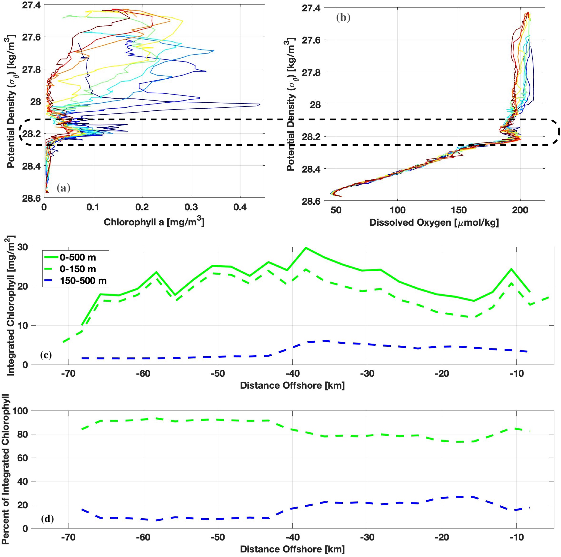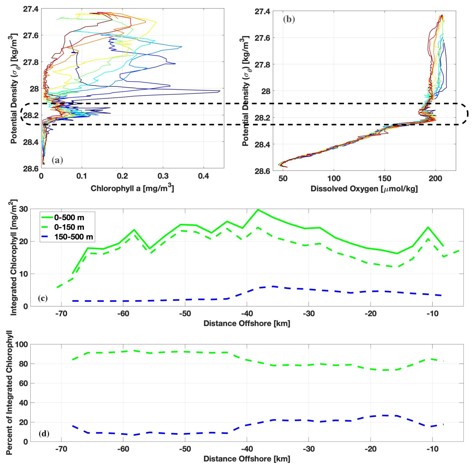 Figure 11Characteristics of the subducted feature in transect 2 on 4–9 February (Fig. 5). Panels (a) and (b show the concentrations of CHL and DO as a function of density for profiles between 20 and 40 km offshore. Panel (c) shows the integrated CHL as a function of distance offshore. The solid green line is the total integrated CHL between the surface and 500 m. The dashed green line is the integrated CHL between the surface and 150 m, and the blue line is the integrated CHL between 150 and 500 m. Panel (d) shows the percentage of the integrated CHL from 0 to 150 m (dashed green line) and from 150 to 500 m (dashed blue line).
