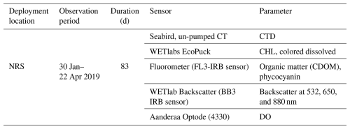 A sustained glider line that was traversed in a 3–4 d period in the NRS was used to capture the wintertime evolution of physical and biogeochemical characteristics in the NRS (Eyouni et al., 2025). The Seagliders (hereinafter “gliders”) were equipped with a conductivity–temperature–depth (CTD) sensor, a dissolved oxygen (DO) sensor, and a triplet fluorometer (Table 1). The glider was deployed along a transect oriented approximately perpendicular to the coastline offshore from Duba, referred to as the “Duba line” (Fig. 1a). The line extended from approximately 5 km off the coast to nearly 75 km offshore. The glider completed each transect in about 3.5 d and was programmed to dive from the surface to ∼750 m. The average horizontal speed was ∼25 cm s−1, and each dive cycle took ∼3 h to complete, depending on the target depth, topography, and sea conditions. The deployment spanned the period from 31 January to 21 April 2019 (Table 1, Fig. 1b).