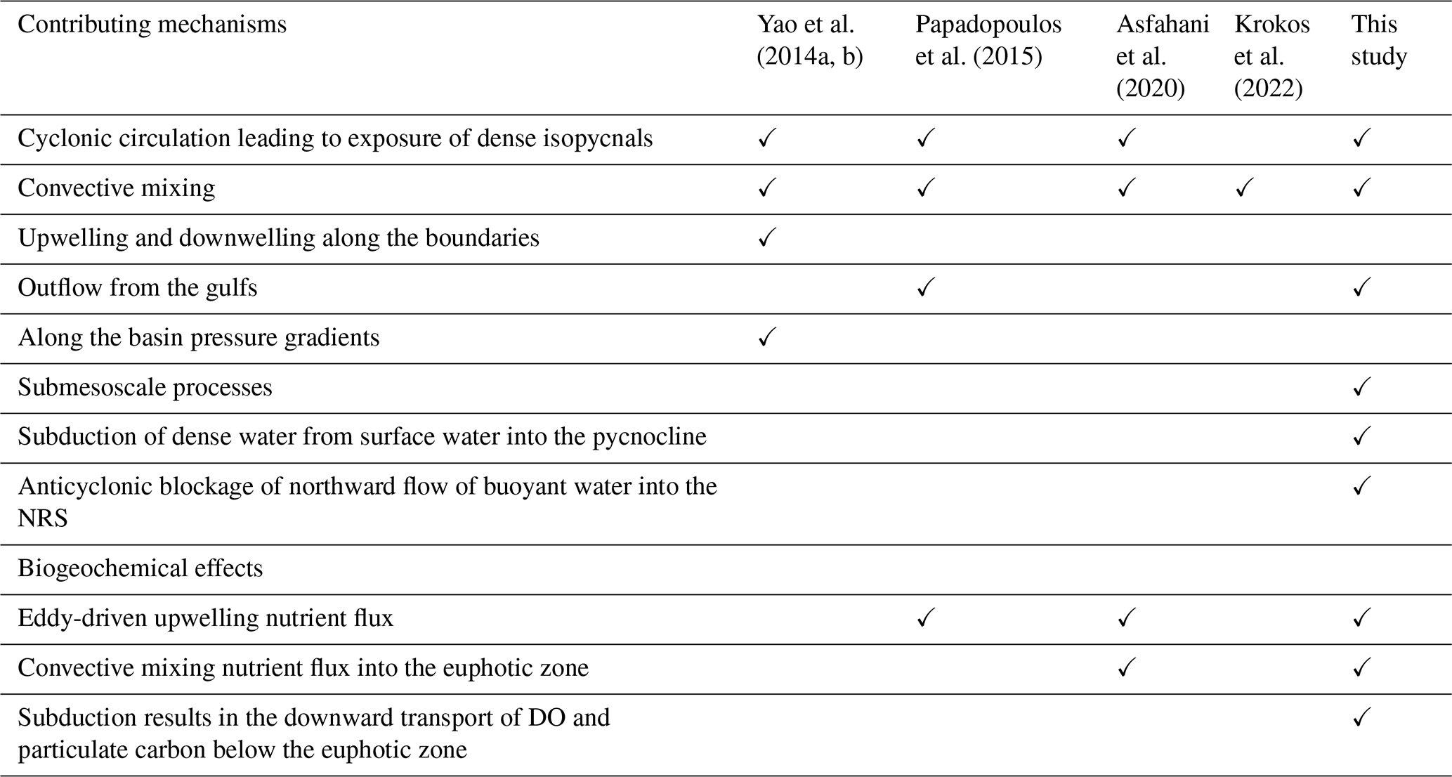 The primary objective of this study was to understand the mechanisms contributing to the water mass formation of RSOW in the NRS and the associated biogeochemical responses. Our findings demonstrate that the RSOW formation is closely linked to the presence of a cyclonic eddy and intense winter cooling, consistent with previous studies (Asfahani et al., 2020; Sofianos and Johns, 2003; Papadopoulos et al., 2015; Yao et al., 2014b). A novel finding of this study is the role of water mass subduction, which, although not previously discussed, contributes not only to the RSOW formation but also to the carbon export as CHL and backscatter indicated that water has been subducted below Zeu (Fig. 12). The observations also indicate that subduction events can significantly contribute to the ventilation of intermediate and deeper waters, thereby affecting the overall oxygen budget of the RS. During these events, oxygen-rich surface waters are transported into subsurface layers along the 28.2 kg m−3 isopycnal, facilitating oxygen redistribution at depth. The study also identified a transition from negative to positive heat flux and the re-establishment of northward flow along the eastern RS coast, signalling the cessation of the RSOW formation as less dense water from the south caps the denser northern waters. The presence of the AE south of the study area prevented the advection of more buoyant surface water, although we could not determine the mechanism for this reversal of CE to AE from our observations and one-dimensional model simulations. This likely influenced the observed water mass originating from the northern gulfs within the RSOW density range, consistent with Papadopoulos et al. (2015). This study highlights that multiple factors can contribute to RSOW formation (Table 2), including dense isopycnal surfacing from cyclonic circulation, vertical mixing, dense outflow from the northern gulfs, water mass subduction, the extension of dense isopycnal exposure due to blockage of buoyant flux from the south, and the eventual termination of these processes as the buoyancy flux is restored. In addition, it is clear that the submesoscale features are present in the region and contribute to the overall physical and biogeochemical dynamics of the region. To comprehensively capture the spatial and temporal dynamics of RSOW formation, future research should prioritize detailed observational and modeling studies, integrating autonomous platforms and ship-based sampling across the entire NRS basin. Such an approach would resolve the three-dimensional variability and provide valuable insights into the sources and sinks involved in RSOW formation and its biogeochemical impacts.