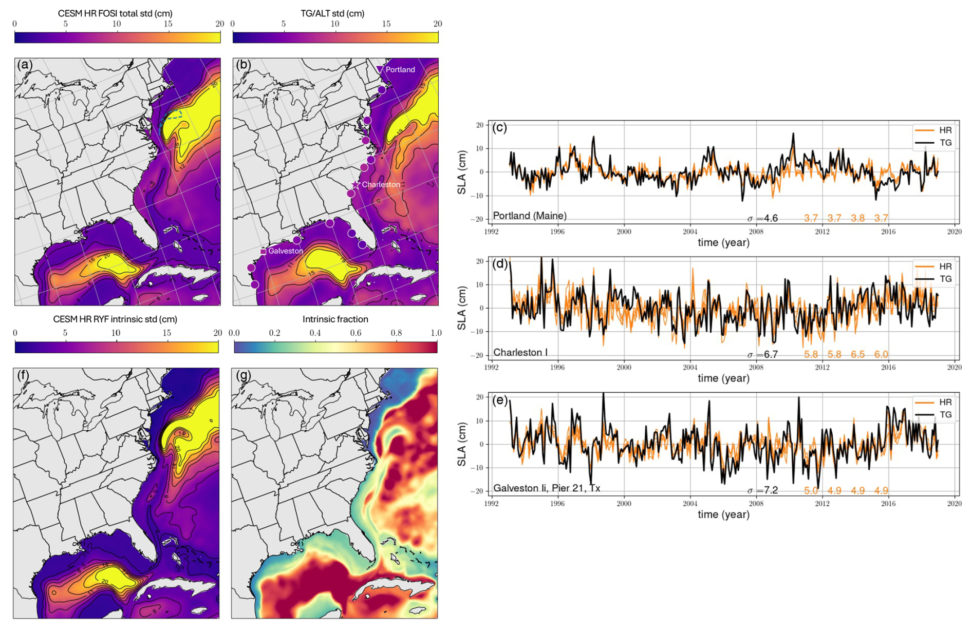 We first compare the total (i.e., forced plus intrinsic) sea level standard deviation from the HR FOSI simulation and observations over the 1993–2018 period (Fig. 1). Total sea level standard deviation (mean across the FOSI members; Fig. 1a) is larger in deep waters and decreases over the continental shelf. Over the same temporal window, a gridded altimeter product (Fig. 1b) shows a similar spatial structure, with the model generally underestimating the observed monthly total sea level standard deviation over the shelf by 10 %–20 %. A similar result was obtained when we compared coastal grid points with the detrended and de-seasonalized sea level recorded by tide gauges (TGs). At three representative locations along the US coastline (Fig. 1c, d, e), discrepancies between model and TG observations were more significant in Galveston (see standard deviations in Fig. 1c, d, e). In contrast, Charleston exhibited the largest inter-cycle differences. Our results show that, overall, sea level hindcasts compare favorably to TG observations over the 1993–2018 period (see Table 1).