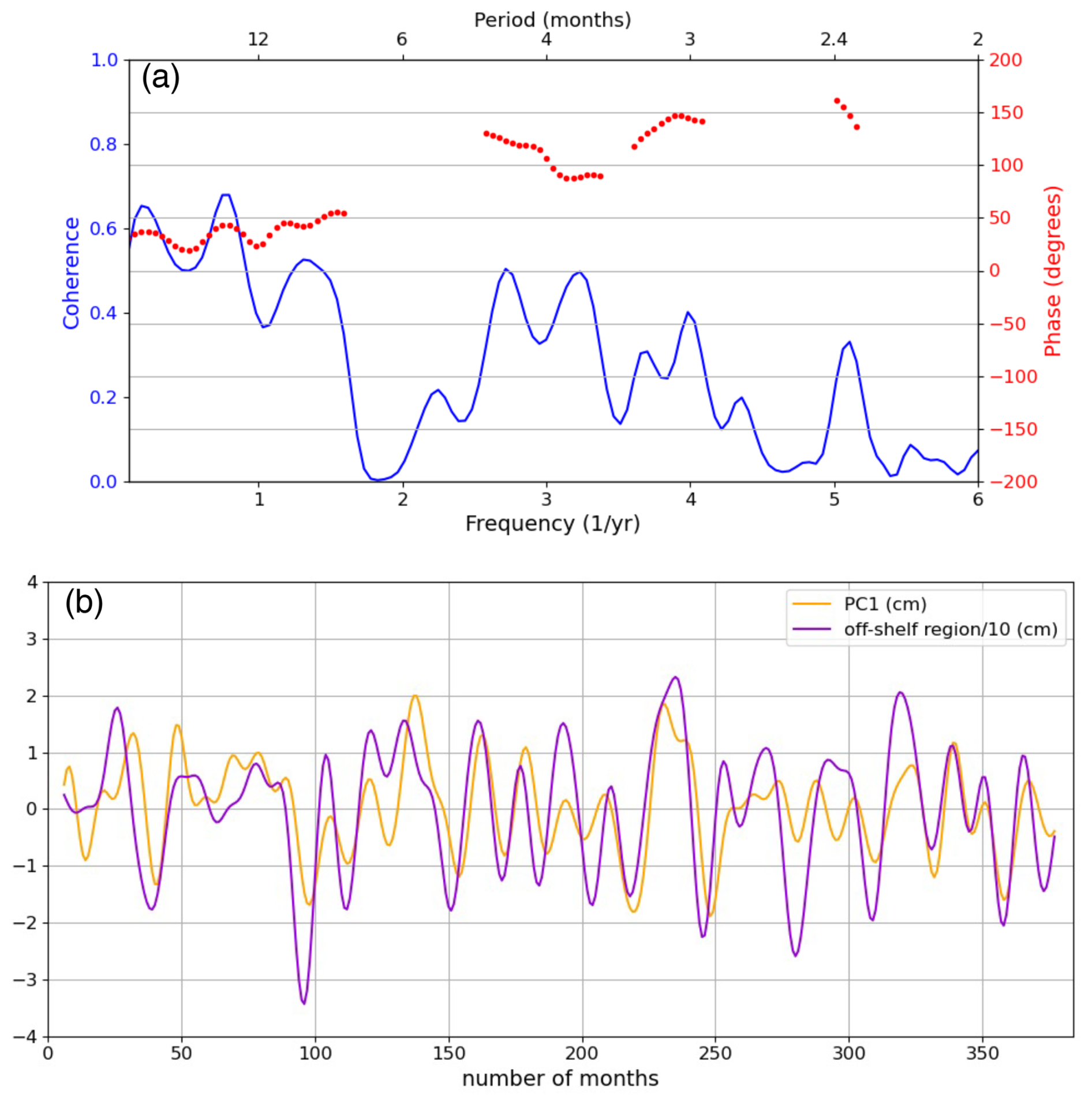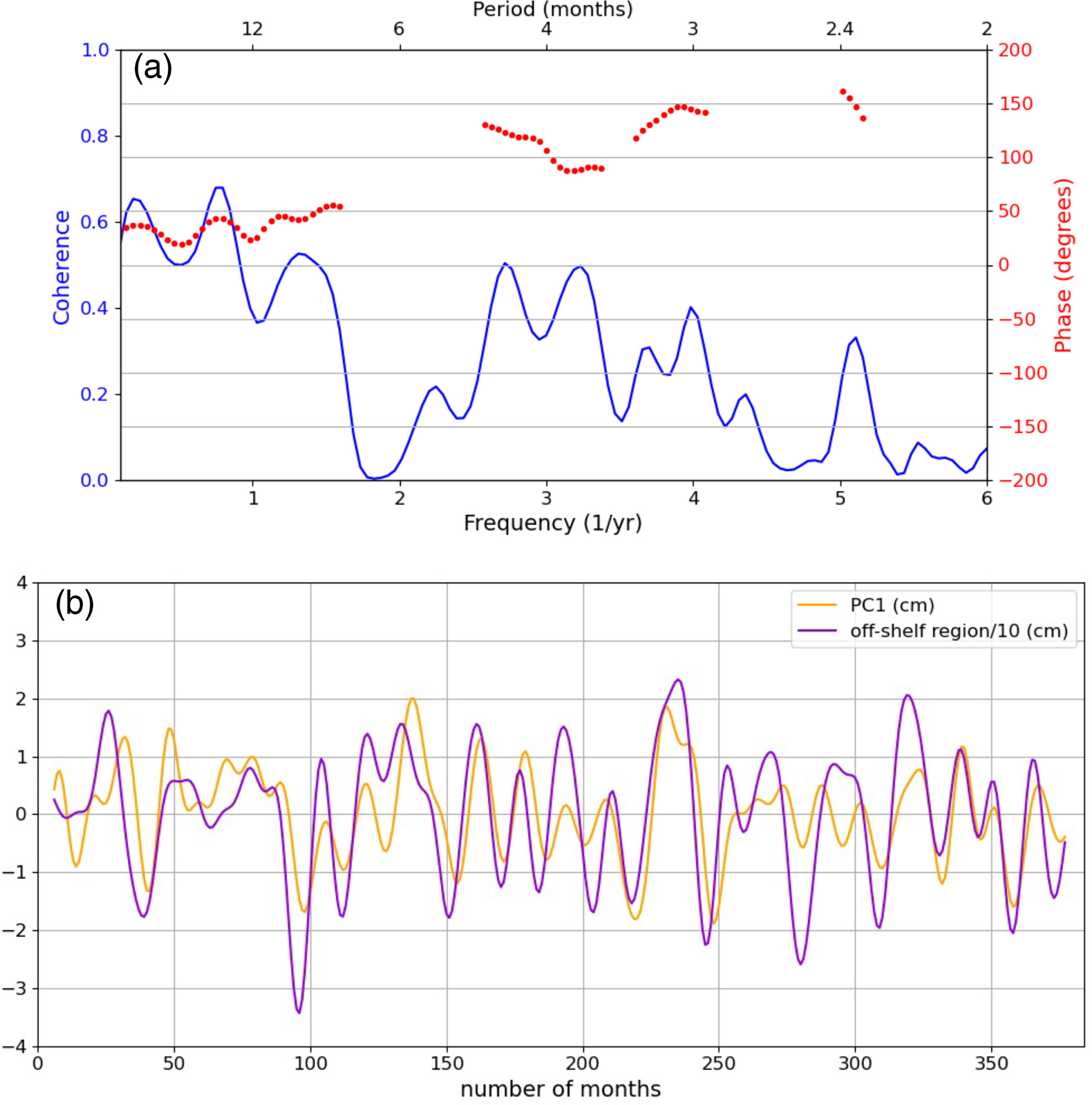 Figure 4(a) Coherence analysis between the PC1 and average SSH signal within the off-shelf region. Note phase lag is only shown for statistically significant coherence (a positive phase means that the off-shelf region leads the PC1). (b) PC1 (cm) and average SSH signal (cm) within the off-shelf region to which we applied a 13-month low-pass filter. The average SSH signal within the off-shelf region is divided by 10.