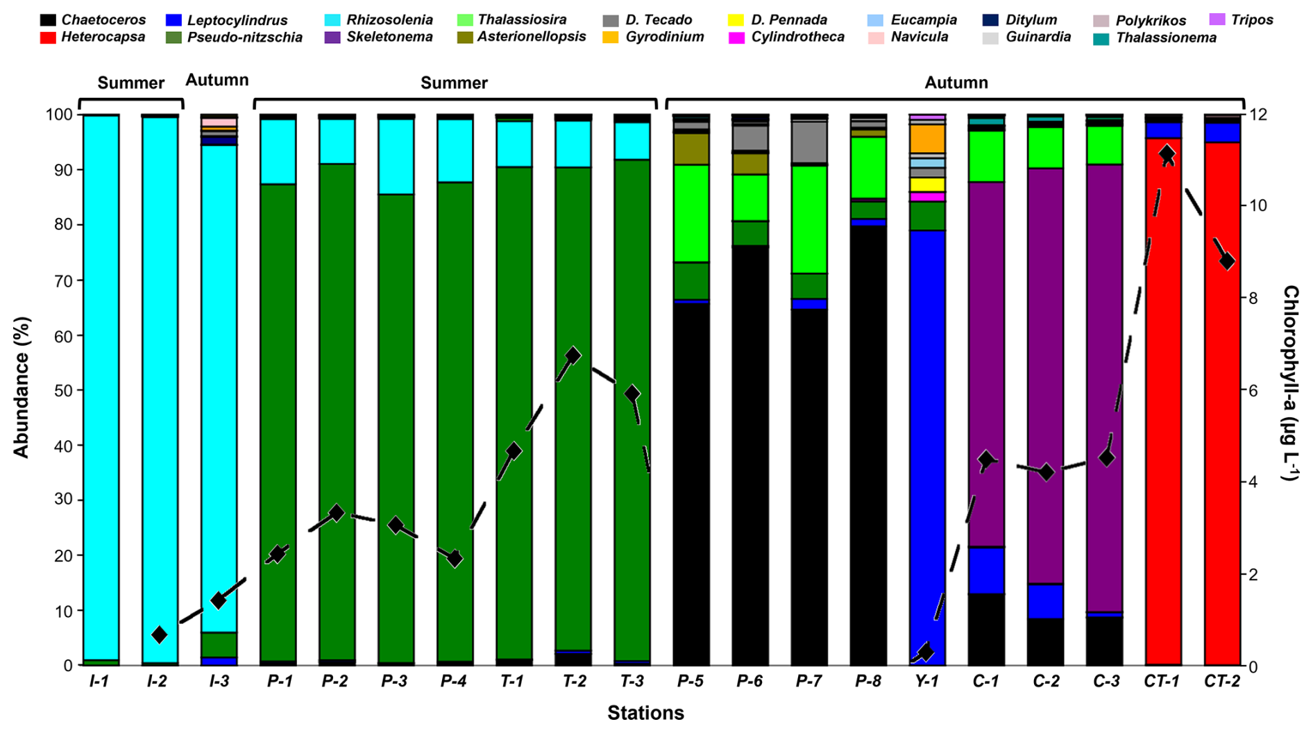 Figure 3Microphytoplankton community composition (histogram) and total biomass (black dotted line) during summer and autumn at sampling locations. Each colour represents a genus of the community. Location codes: I = Ilque, P = Pulelo, T = Isla Tenglo, Y = Yaotal, C = Chaparano, and CT = Canal Tenglo.