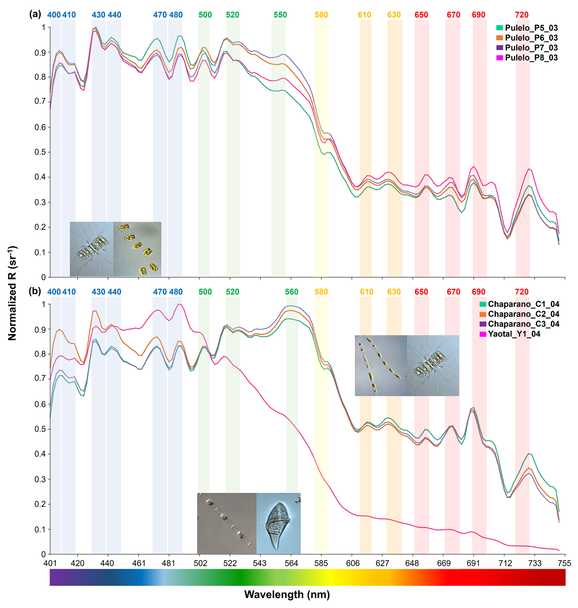 Figure 4Diatoms spectral signals: (a) Rhizosolenia sp. at Ilque (aqua green, orange and purple lines); (b) Pseudo-nitzschia sp. at Pulelo (aqua green, orange, purple and pink line) and Isla Tenglo (jasmine green, yellow and brown line) (∼41.45–42.75° S).
