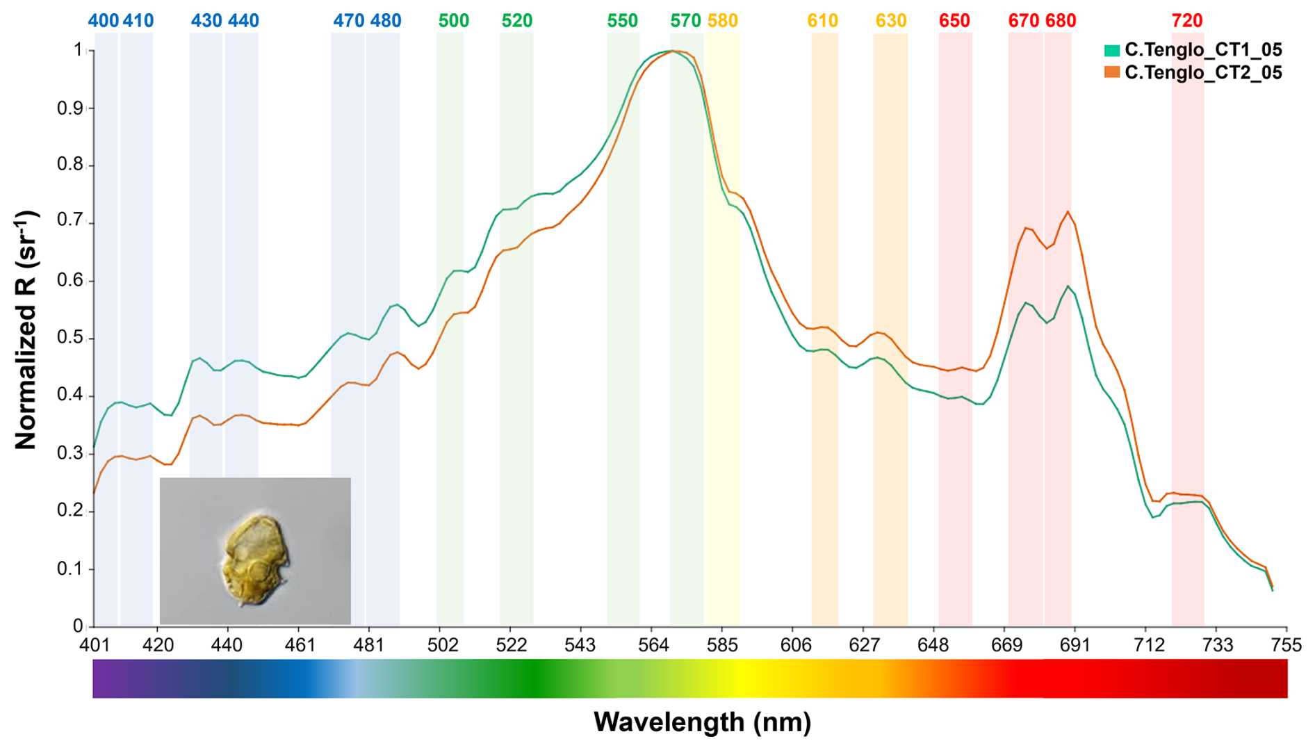 In the present study, two main groups (diatoms and dinoflagellates) and three sub-groups of phytoplankton assemblages were identified through the R(λ) spectrum, with a variability observed not only between groups, but also among genera. Although the R(λ) spectrum of different diatom genera was similar in shape and magnitude across the blue to green bands (∼400–520 nm), the spectral signal enabled the “fingerprints” of different genera to be detected. These differences are especially observed at the blue (∼400–490 nm) and the red to near infra-red bands (∼650–740 nm), where the absorption and fluorescence of accessory pigments are highest (Kramer et al., 2022).