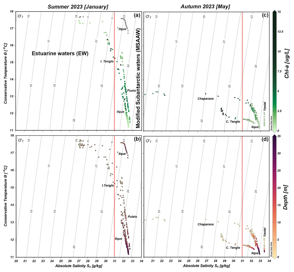 Figure 7Conservative temperature and absolute salinity scatter diagram, including density (σ) isoline (grey vertical lines) collected during the 2023 summer and autumn oceanographic campaigns. Images (a) and (c) show incorporation of Chl a; images (b) and (d) show water depth where data was obtained. In (a) the grey dots in the Ilque area denote no Chl a data.