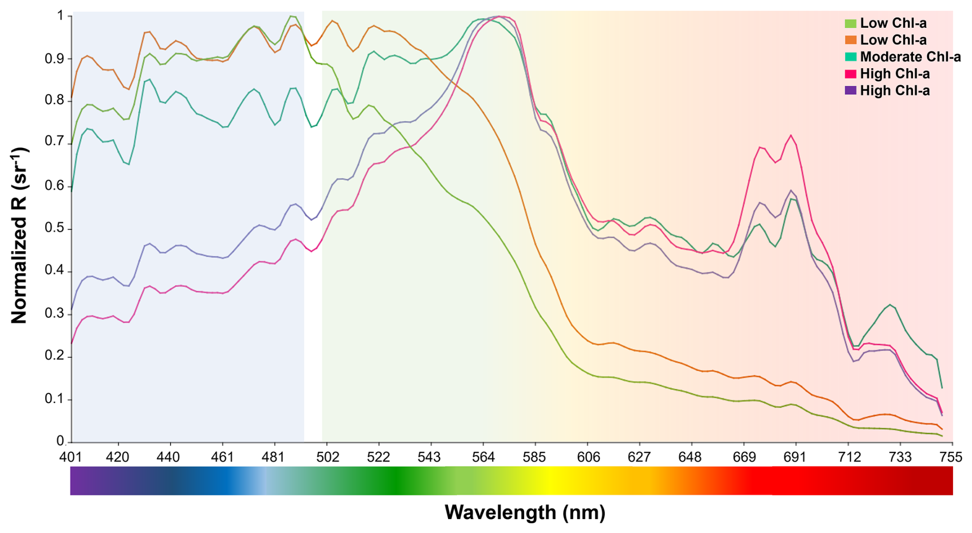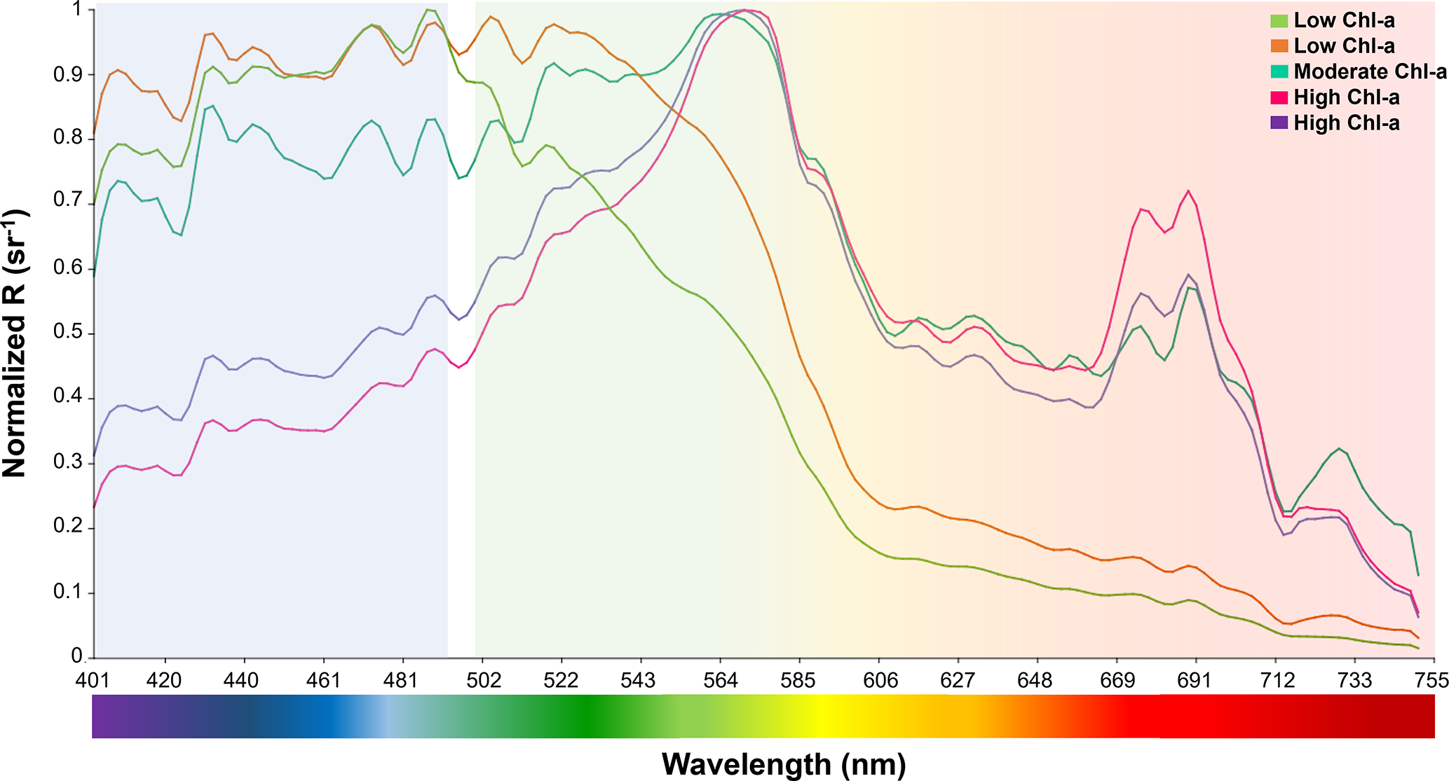 Figure 8Microphytoplankton spectral signals with different Chlorophyll a concentrations. Low chlorophyll a (<2 µg L−1) (jasmine green and orange lines); moderate chlorophyll a (>4 to 7.9 µg L−1) (aqua green line); and high chlorophyll a (>8 µg L−1) (pink and purple lines).
