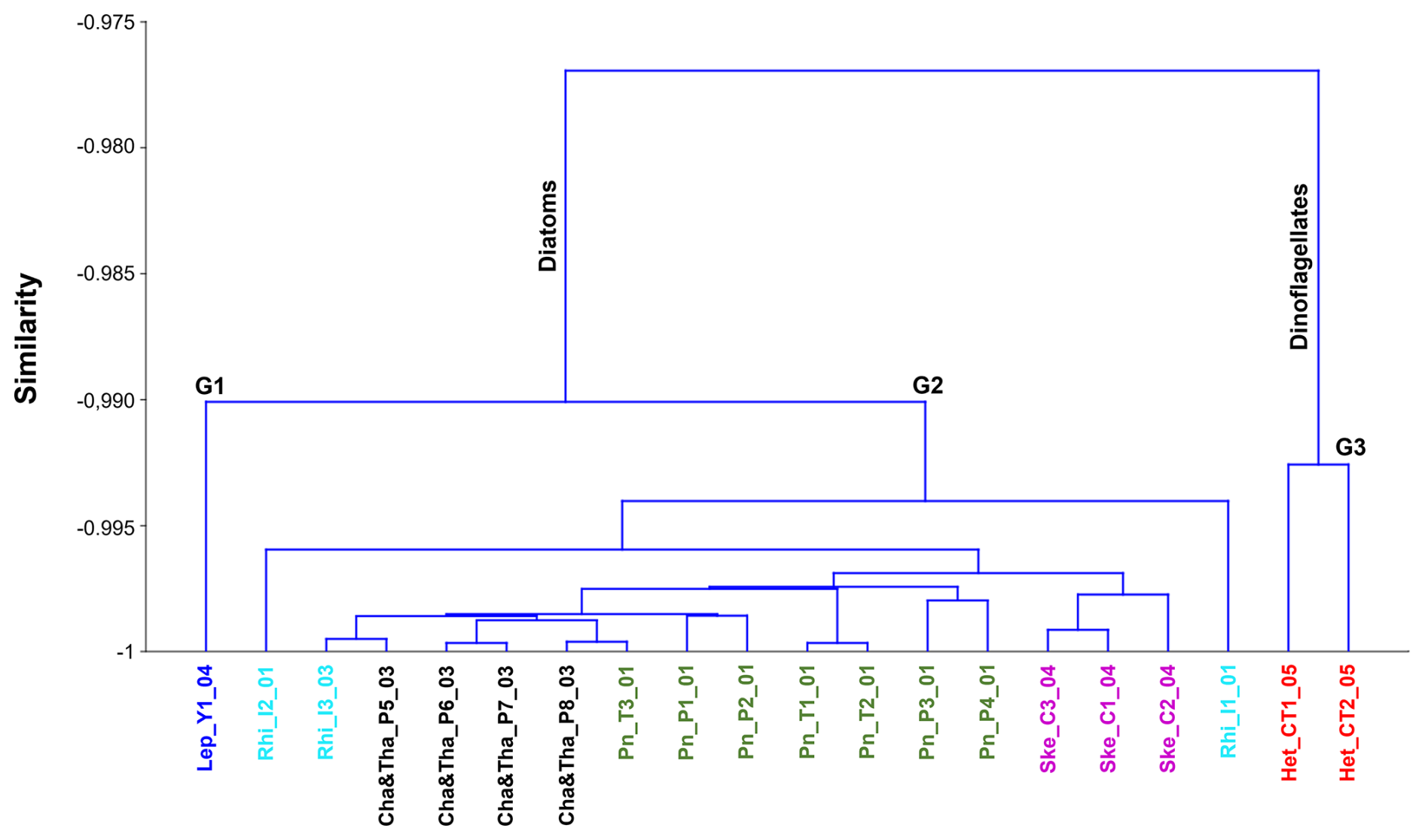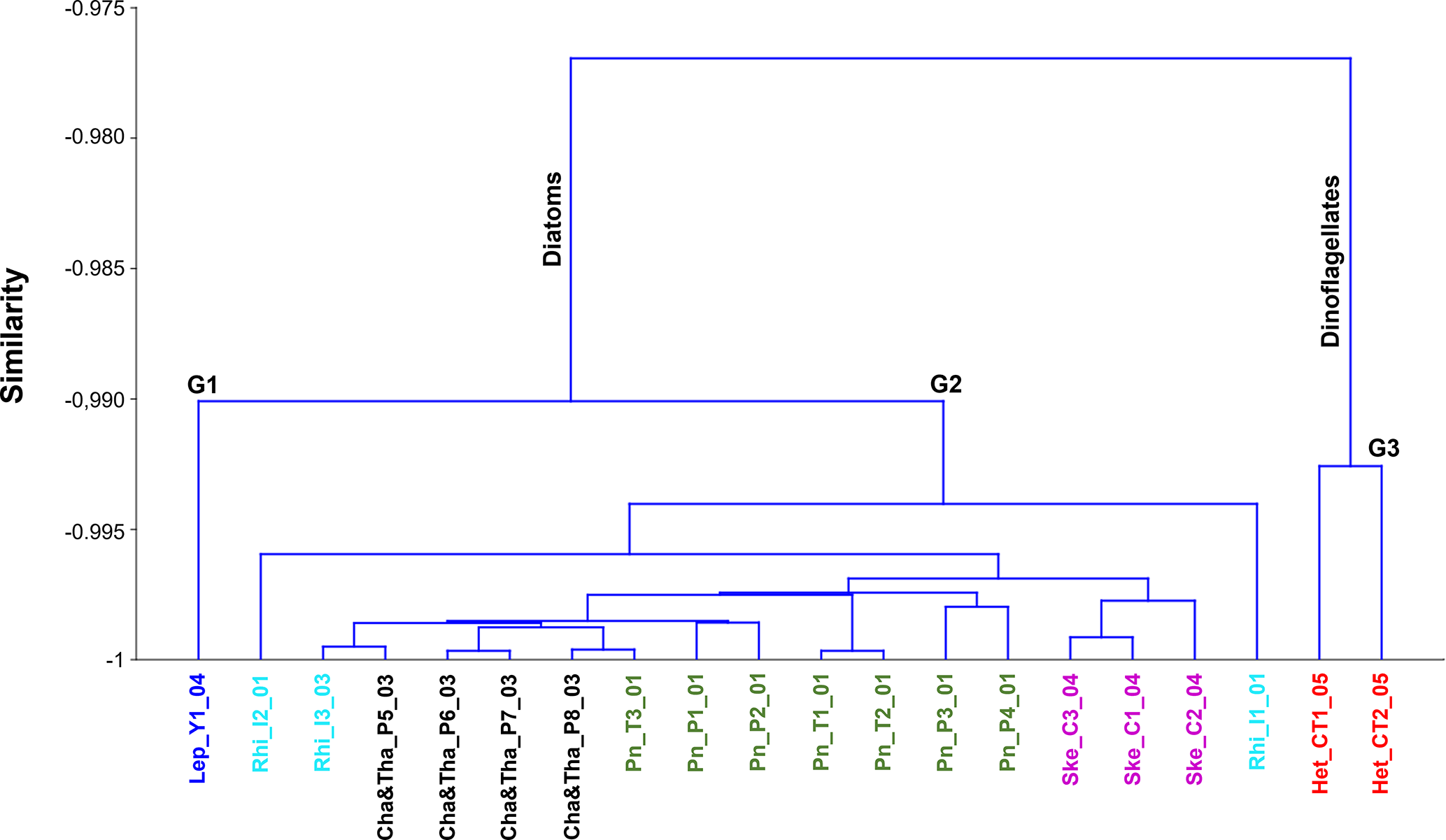 Finally, the cluster analysis grouped together spectra that corresponded to stations under the same dominant groups and genera more closely (Fig. 9). Although similarity values were high, two main distinctions were identified: the first relates to locations being grouped together due to the dominance of diatoms, while the second relates to locations grouped together due to the dominance of the dinoflagellate Heterocapsa triquetra (Canal Tenglo) (Fig. 9).