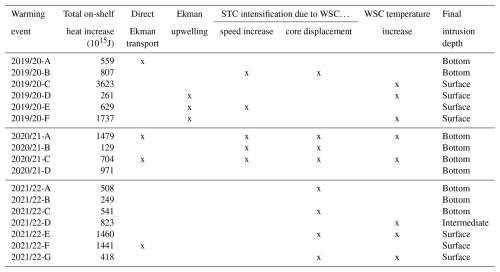 Based on the final data set prepared using the methods described in Sect. 2.2, we identify 17 individual warming events in the winter seasons of the study period. These include six events during the first winter (2019–2020), four during the second winter (2020–2021), and seven during the final winter (2021–2022), as summarized in Table 1. The events exhibit substantial variability with respect to their duration, with the shortest lasting 15 d and the longest extending to 40 d from the start of the eastward expansion of the isotherms to the time they reach their maximum extent on the WSS. Moreover, the events differ with respect to which isotherms are expanding, depending on the relative temperature difference between the intrusion and the ambient water on the WSS. The warming event magnitude, quantified by the total increase in relative heat on the shelf, ranges from +129 to +3623 PJ, with an average daily heat increase of +41 TJ d−1 (standard deviation: 24.7 TJ d−1). In the following, we categorize these warming events based on their shelf-intrusion characteristics and examine the role of different cross-shelf exchange mechanisms in their development.