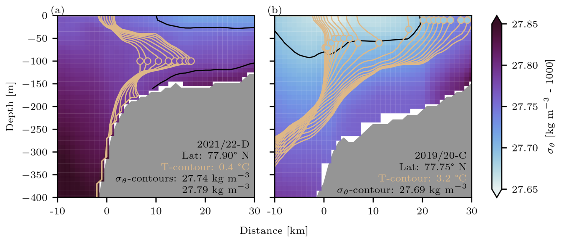 In the context of discussing the impact of shelf stratification, we present two more examples, highlighting further variations in the intrusion depths. Figure 7a shows the day-to-day propagation of the 0.4 °C isotherm at 77.9° N during warming event 2021/22-D. The background color reveals that during the warming period, the shelf stratification is weak and zonally uniform (indicated by the two example isopycnals in Fig. 7a). Furthermore, there is no density front separating the shelf from the slope. This means that water masses from the shelf and the slope can readily exchange places in a so-called interleaving layer. This layer is not necessarily found at the surface or the bottom of the water column but, rather, at the depth where the density of the intruding water exactly matches that of the ambient shelf water. In the presented example, this is the case at an intermediate depth of 100 m, where the intrusion propagates eastward.