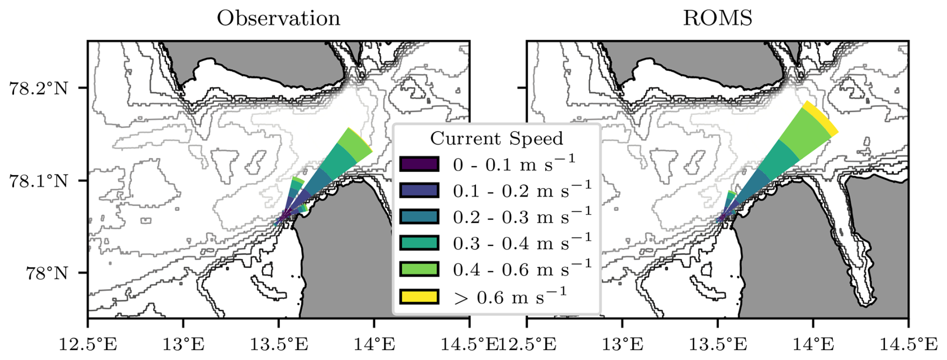 The overestimation of high current speeds observed in the time series in Fig. B3g is also evident in the current roses shown in Fig. B4. However, the general inflow pattern into Isfjorden at the mooring location is well represented in the simulations, indicating that the model captures the dominant circulation features well. The strong influence of bathymetry on current directions throughout the water column is clearly reflected in both observations and simulations. With the mooring positioned at a bottom depth of 200 m and measurements taken at 65 m depth (hydrography in 2020–2021 at 54 m), the model accurately resolves topographic steering effects, ensuring a realistic representation of the observed flow. Given this strong agreement, similar model performance can be expected further out on the WSS and along the shelf break, supporting the reliability of the simulated current dynamics in the broader study region.