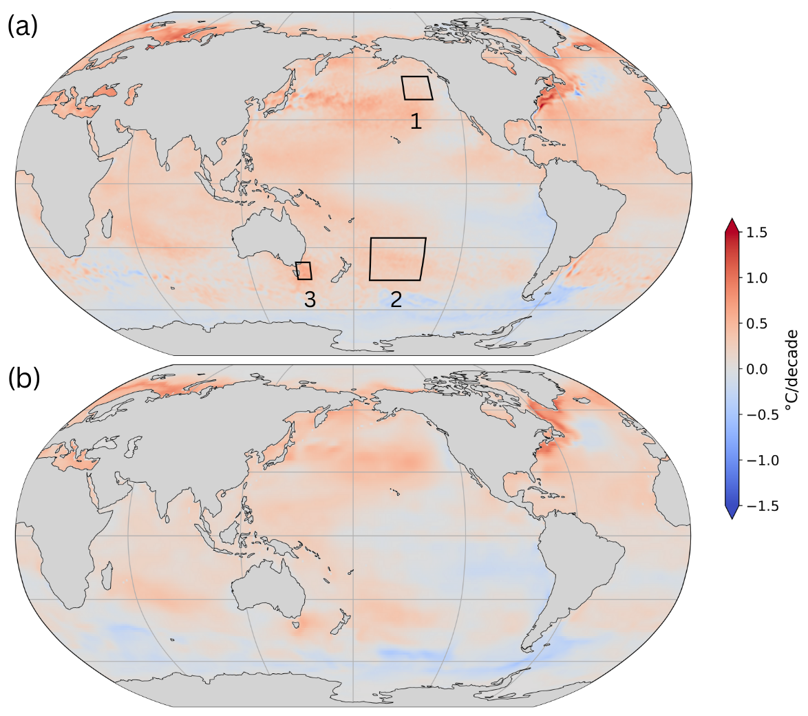 Figure 1Linear trend in (a) sea surface temperature based on the NOAA OISST V2 data product and (b) near-surface temperature from the ECCO v4r4 ocean state estimate (°C per decade). The trend is estimated from monthly data over the period from 1992 to 2017. Boxes in panel (a) also show the regions of interest in our analysis: (1) the northeastern Pacific, (2) the southwestern Pacific, and (3) the Tasman Sea.