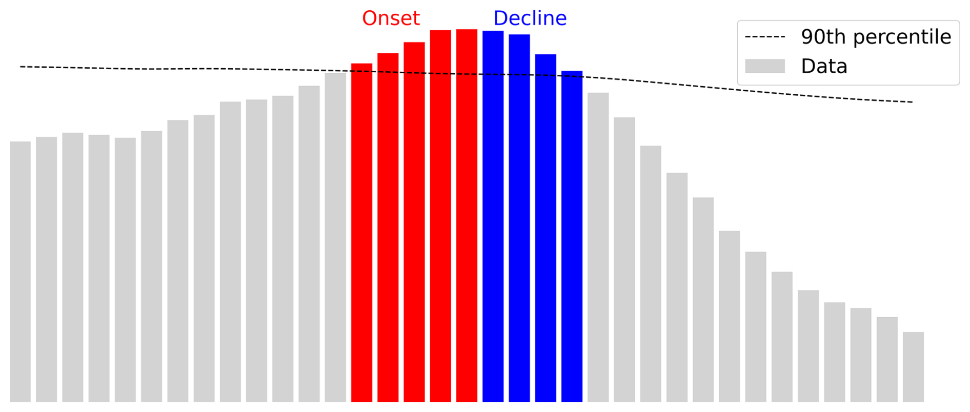 Once the percentiles are calculated and the MHW thresholds are applied, we can identify the start and end dates of each event, track their evolution, and analyze their duration. Additionally, when using daily data, we can identify the MHW onset vs. decline phase, with the onset phase going from the start of the event to the peak intensity (included) and the decline starting just after the peak intensity and going to the end of the event (Fig. 2). By explicitly defining different phases, we can study processes driving MHW intensification and dissipation.
