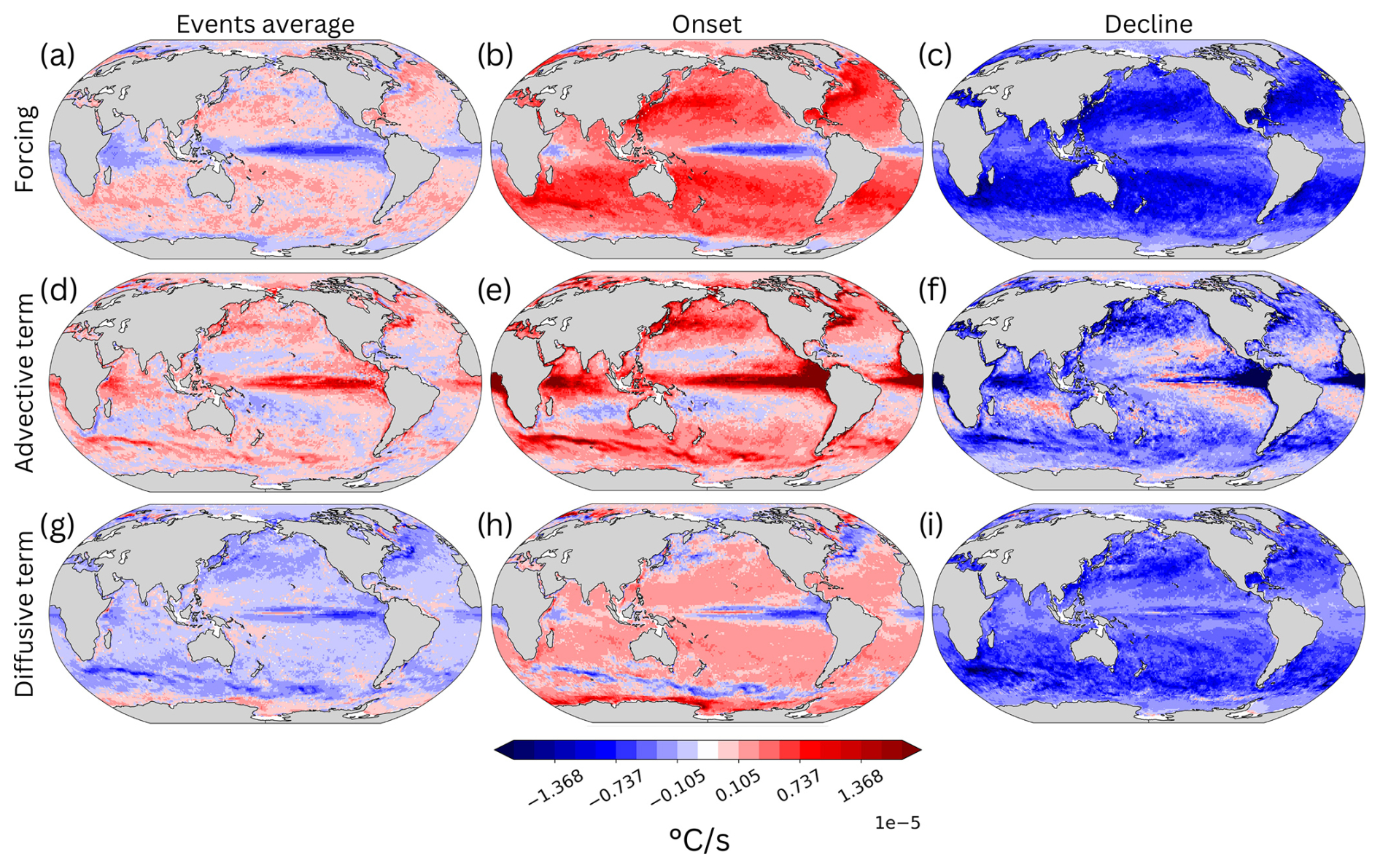 In most of the ocean, the composite amplitude of atmospheric forcing during MHW onset and decline is larger than the amplitude for advective and diffusive convergence (Fig. 7b and c). The spatial distribution of this term is quasi-uniform, with the exception of the tropics. Atmospheric forcing contributes to warming during the onset phase and cooling during the decline (i.e., it is positive during the onset and negative during the decline phase) in most regions of the global ocean and for most events (Figs. 8 and 9); however, on average, atmospheric forcing cools the upper ocean during both the onset and decline phase near the Equator (Fig. 7b and c). In addition, it contributes to the decay most of the time (Fig. 8a and b), consistent with previous studies (Holbrook et al., 2019; Vogt et al., 2022). In equatorial regions, advective convergence plays a lead role in the onset and decline of MHW (and ENSO) warm anomalies (Figs. 9c and d and 10a–d), consistent with ENSO dynamics (e.g., Jin, 1997; Capotondi, 2013). On average, advective convergence contributes to both the onset and decline phase only near the Equator (Fig. 7e and f); in the subtropics and western boundary currents, consistent with previous studies (e.g., Li et al., 2022; Zhang et al., 2023); in the southern Red Sea and Gulf of Aden (Nadimpalli et al., 2025); and along the Antarctic Circumpolar Current (Fig. 7e and f). In these regions, the advective convergence is most often a contributor only to the onset phase (Fig. 8c), except for the eastern equatorial Atlantic and Pacific and the southern Red Sea and Gulf of Aden where it is most often also a contributor to the decline phase (Fig. 8d). As the composite amplitude of atmospheric forcing and advective convergence are similar between MHW onset and decline, the composite event average amplitude for each resembles the positive vs. negative patterns described for the onset (except values are much smaller; Fig. 7a and d). The patterns for the composite event average amplitude of diffusive convergence (Fig. 7g) are instead similar to what is seen for the decline phase (Fig. 7h), as, while the duration of the decline phase is on average shorter, the composite amplitude of diffusive divergence (i.e., negative values of diffusive convergence, corresponding to heat loss) is larger for the decline phase (Fig. 7i). The spatial patterns of the composite amplitude of diffusive convergence during MHW onset and decline are similar to what described for atmospheric forcing (except during the onset phase in proximity of western boundary currents and the Antarctic Circumpolar Current), yet values for diffusive convergence are smaller (Fig. 7h and i) and diffusive divergence is most often a contributor globally only to the decline phase, being a leading term at high latitudes (Fig. 9e and f). On average, the amplitude of diffusive divergence during the decline phase is larger in regions characterized by strong oceanic fronts, such as western boundary currents and the Antarctic Circumpolar Current (Fig. 7i). In these areas, diffusive processes help dissipate warm anomalies, suggesting that turbulent mixing is a key mechanism in reducing excess heat and restoring thermal equilibrium (Oliver et al., 2021; Vogt et al., 2022). While diffusive convergence is generally not a leading term for MHW onset (except near Antarctica), there are events when this happens, indicating that a variety of leading dynamical mechanisms are seen in most regions. Moreover, diffusive convergence contributes to the onset phase most often in some of the tropics, off the Equator (Fig. 8e and f).