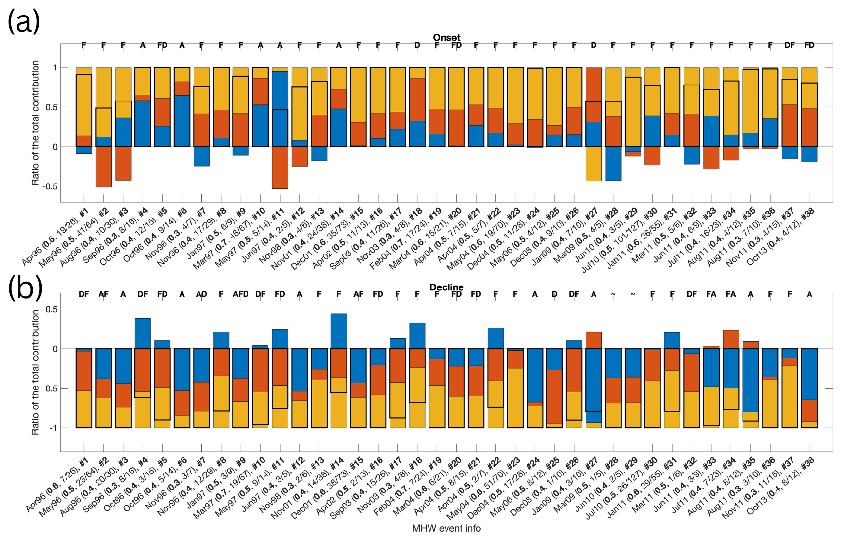 Figure 11MHW events in the northeastern Pacific (NEP, region 1 in Fig. 1) based on the ECCOv4r4 upper-ocean (5–55 m) heat content: ratio of the total contribution for each budget term during each phase (onset/decline), as well as the tendency (also scaled by the total contribution). Panel (a) shows the onset phase, whereas panel (b) shows the decline phase. Each stacked bar represents the relative contribution of each term during that phase, with the total contribution (i.e., the sum of the terms that contribute to that phase) normalized to 1. The black outline over each bar indicates the total temperature tendency during that phase (scaled by the total contribution to that phase), showing agreement with the sum of the individual terms and confirming budget closure. The x-axis labels denote the start date of each MHW event, followed by values in parentheses indicating the event intensity (as average temperature (°C) in the layer used for the OHC estimate), onset/decline duration (in days), and total duration. The letter codes above each bar indicate which term(s) dominated the total temperature tendency during that phase (A – advection; D – diffusion; F – forcing). For example, “F” is used for cases in which the forcing provides the leading contribution; “FA” is used when both forcing and advective convergence provide a leading contribution; “AFD” characterizes cases in which advective convergence is larger than forcing and diffusive convergence and forcing are larger than diffusive convergence, yet the difference does not meet the 30 % criterion as in the previous two cases; and, finally, “∼” corresponds to cases in which all terms contribute comparably.