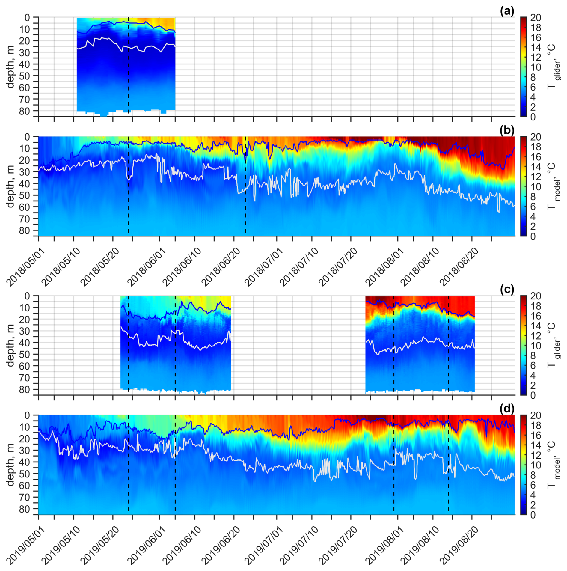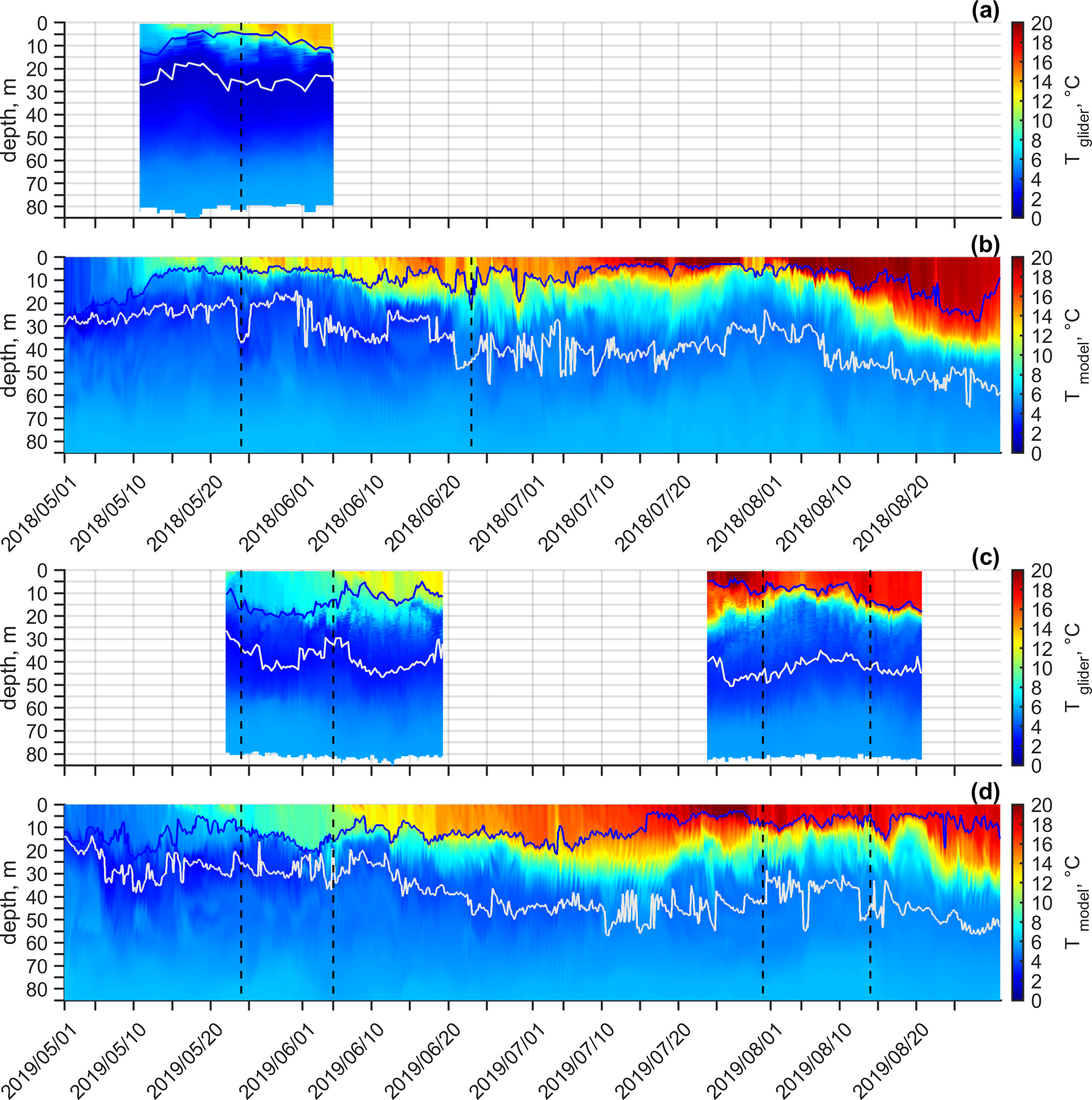 Figure 3Temperature variability based on glider data (a, c) and model data (b, d) for May–August 2018 (a, b) and 2019 (c, d). The glider data represent average profiles for each section within the selected area, forming a composite temperature field. The model data show average profiles within a 1×1 km window at each model output time. Blue and white lines indicate the depths of the UML and the CIL, respectively. Vertical black lines indicate the dates shown in Fig. 8: 24 May and 23 June 2018 (a, b); 24 May, 5 June, 31 July, and 14 August 2019 (c, d).