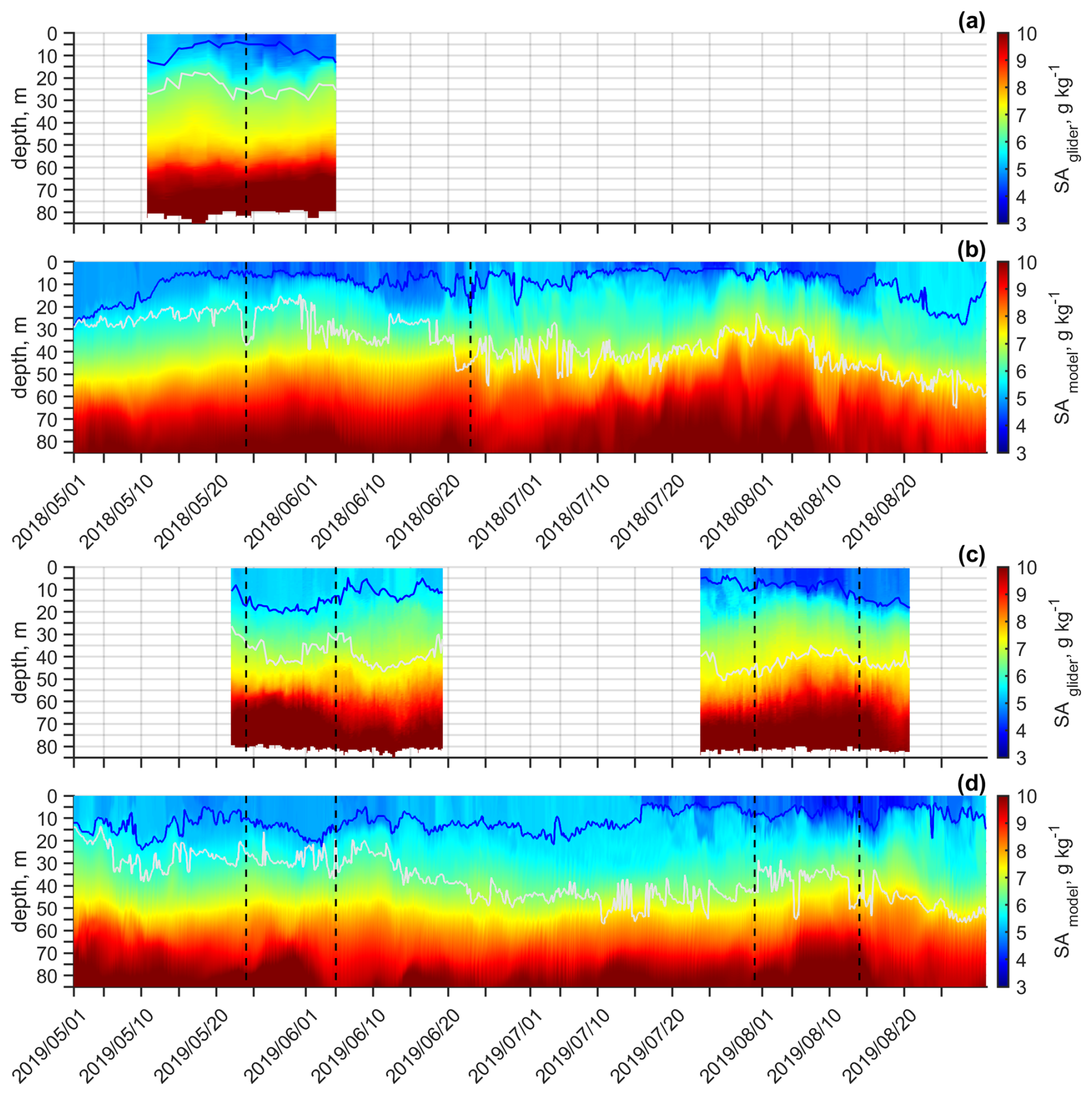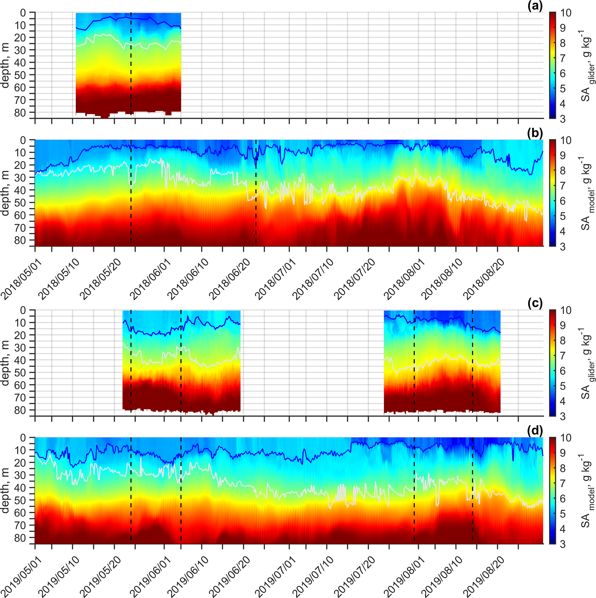 Figure 4Salinity variability based on glider data (a, c) and model data (b, d) for May–August 2018 (a, b) and 2019 (c, d). The glider data represent average profiles for each section within the selected area, forming a composite salinity field. The model data show average profiles within a 1×1 km window at each model output time. Blue and white lines indicate the depths of the UML and the CIL, respectively. Vertical black lines indicate the dates shown in Fig. 8: 24 May and 23 June 2018 (a, b); 24 May, 5 June, 31 July, and 14 August 2019 (c, d).