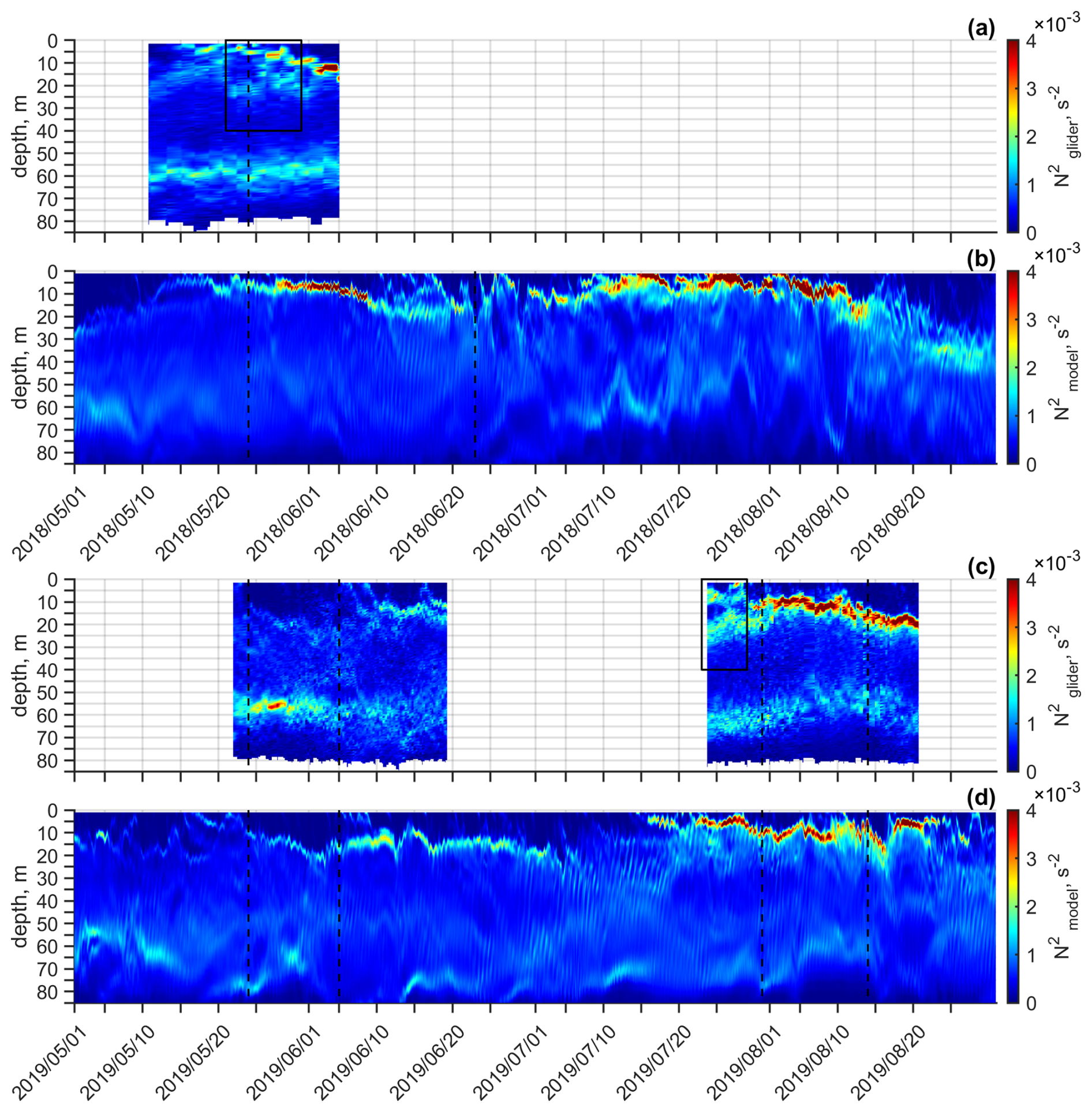 Figure 5Variability of vertical stratification presented as Brunt–Väisälä frequency squared (N2) based on glider data (a, c) and model data (b, d) for May–August 2018 (a, b) and 2019 (c, d). The glider data represent average profiles for each section within the selected area, forming a composite salinity field. The model data show average profiles within a 1×1 km window at each model output time. Vertical black lines indicate the dates shown in Fig. 8: 24 May and 23 June 2018 (a, b); 24 May, 5 June, 31 July, and 14 August 2019 (c, d). Black boxes indicate periods of two observed local maxima in N2: 21–30 May 2018 (a) and 23–28 July 2019 (c).
