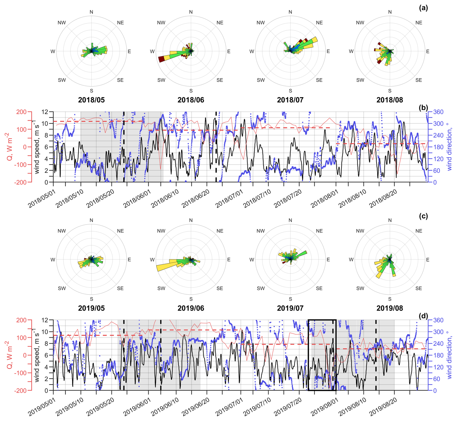 Figure 7The daily average net surface heat flux, Q, (red, dashed line showing the monthly average), wind speed (black) and direction (blue) in spring–summer 2018–2019 (b, d). Panels (a) and (c) show the wind roses from May to August for both years, respectively. Vertical black lines indicate the dates shown in Fig. 8: 24 May and 23 June 2018 (b); 24 May, 5 June, 31 July, and 14 August 2019 (d). The black box indicates the period examined in Sect. 3.4: 23–31 July 2019 (d).