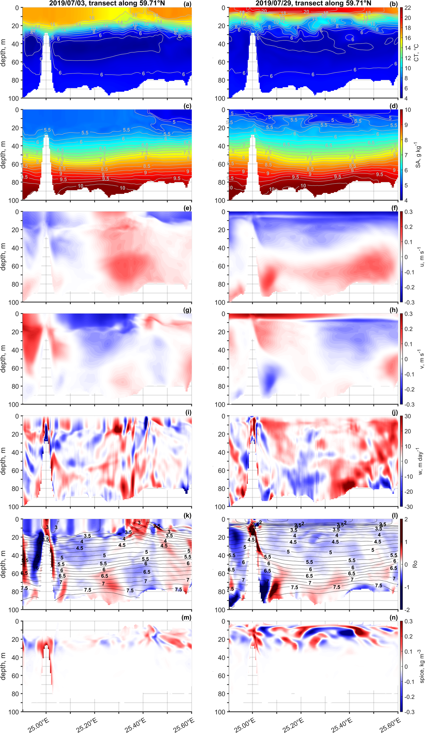 Figure 13Vertical sections along zonal transects at 59.71° N on 3 July (a, c, e, g, i, k, m) and 29 July 2019 (b, d, f, h, j, l, n), showing (a, b) Conservative Temperature (°C), (c, d) Absolute Salinity (g kg−1), (e, f) zonal velocity u (m s−1), (g, h) meridional velocity v (m s−1), (i, j) vertical velocity w (m d−1), (k, l) Rossby number (Ro) with overlaid isopycnals (0.25 kg m−3 intervals), and (m, n) spice (kg m−3).