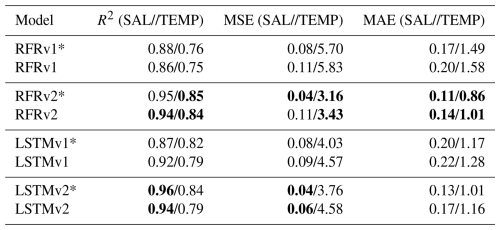 Table 5R2, mean squared error, and mean absolute error metrics for salinity and temperature for the different models. The best-performing model is highlighted in bold text for each metric. The asterisk indicates that the model does not account for uncertainties in the measurements.