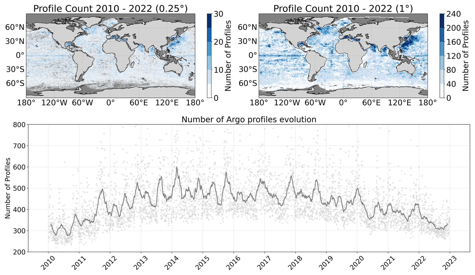 (Boutin et al., 2025)(Olmedo et al., 2020a)(Olmedo et al., 2020b)(NASA/JPL, 2020)(Remote Sensing Systems, 2024)(Yueh, 2018) (Good et al., 2020)(Wentz et al., 2021)(Canada Meteorological Center, 2012)(E.U. Copernicus Marine Service Information (CMEMS), 2024b)(NASA/JPL, 2015) (E.U. Copernicus Marine Service Information (CMEMS), 2024a)(Dohan, 2021)Figure 1Distribution of the Argo profiles with at least 1000 m depth and good quality data from 2010 to 2022. The top row shows the spatial distribution at 0.25°×0.25° and 1°×1° regular grid. The bottom row shows the temporal distribution in a daily resolution (gray) and a 60 d mean sliding window (dark gray).