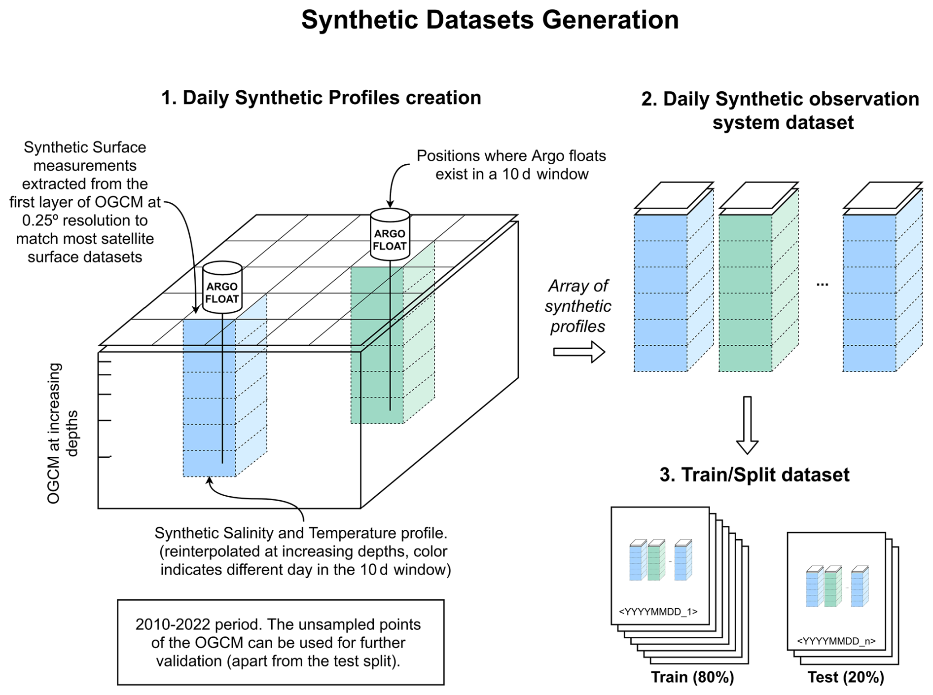 Finally, we separate our datasets into a train/test split, which will be common for all the trained models. This separation is made using an ratio, where 80 % of data will be used for training and 20 % for validation as usual in machine learning models. We generate one dataset (or datafile) for each day. As the objective of our study is to analyze the feasibility of the reconstruction using current sampling of the ocean (and not predicting future trends and events), the separation is done by randomly separating the dates, but ensuring that each month is represented equally in both datasets. This avoids adding imbalances due to seasonal cycles that must be accounted for.