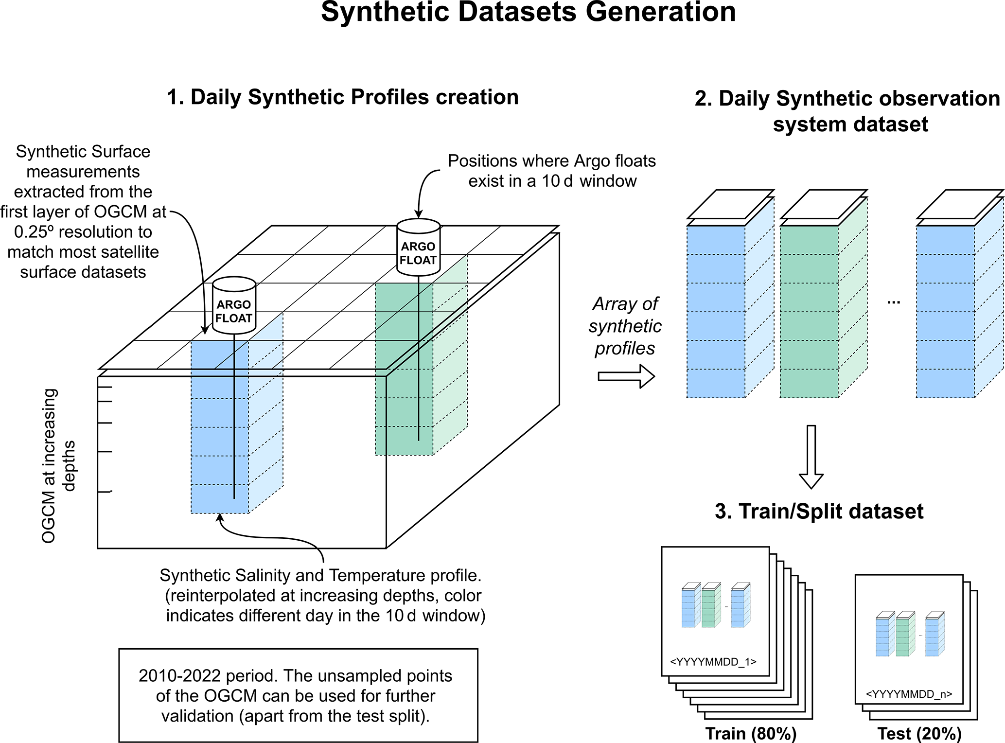 The integration of AI and data-driven methodologies has transformed physical oceanography, which was traditionally dominated by theoretical models and limited observational data. In recent years, oceanography has experienced a surge of interest in data-driven approaches, fueled by advances in computational resources, the availability of larger oceanographic datasets (e.g., from Argo, satellite missions, and reanalyses), and the growing maturity of deep learning frameworks. Notably, one of the earliest applications of neural networks in this field dates back to 2009, when Ballabrera-Poy et al. (2009) demonstrated the potential of simple neural architectures to improve the reconstruction of subsurface salinity profiles in the eastern North Atlantic. More recent research has demonstrated significant progress in reconstructing 2D and 3D ocean variables. Subsurface salinity has been reconstructed at 0.25°×0.25° resolution in Tian et al. (2022) by enhancing coarser resolution products (1°×1° at a monthly scale). Subsurface temperature and salinity anomalies were reconstructed in Su et al. (2015, 2018, 2021) using monthly gridded Argo data and AI models such as Support Vector Machines and Long-Short Term Memory (LSTM) Neural Networks. They used monthly gridded Argo data at 1°×1° resolution to perform their reconstruction. Buongiorno Nardelli (2020) proposed a deep learning network to reconstruct the ocean water column using combined satellite and in-situ measurements. Their innovative approach consists of using the potential of the LSTM not to predict a time series, but to predict a depth series. As in the previous studies, a gridded in situ dataset with monthly temporal resolution was used.