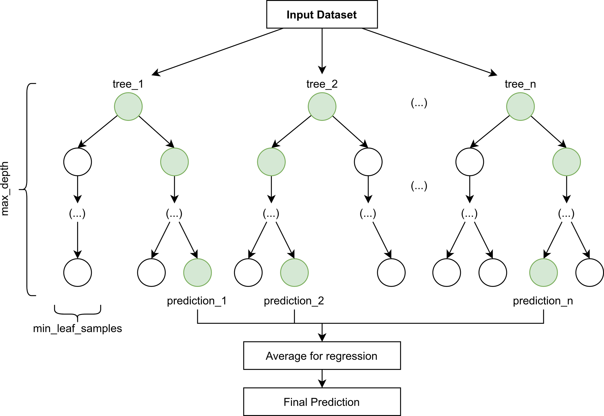 Figure 4Random Forest Regressor structure. The final prediction is the average of all individual tree predictions, reducing overfitting and variance compared to using a single decision tree.