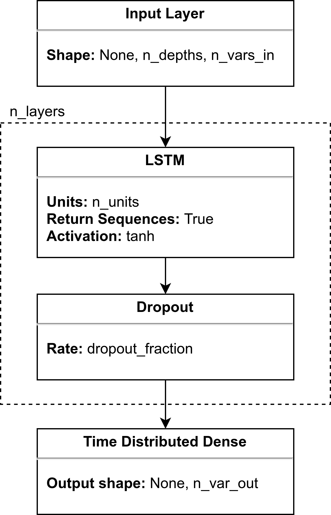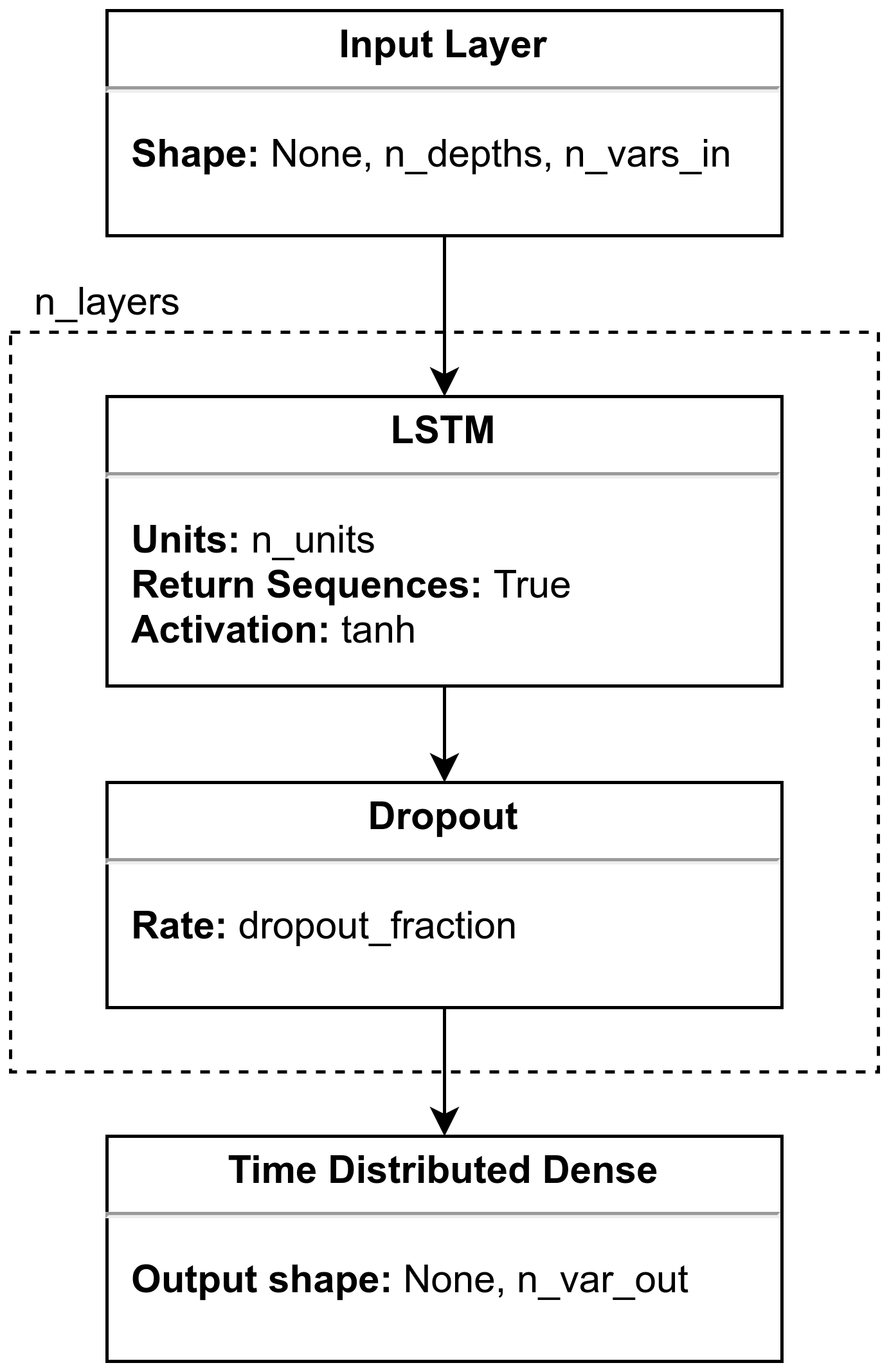 Figure 5Model architecture using LSTM layers. The model takes as input a list of points to predict, where each point is a matrix of n_depths × n_vars_in positions. Then, it connects with n_layers groups of LSTM + Dropout layers. Finally, a Time distributed Dense layer that produces the final predictions.
